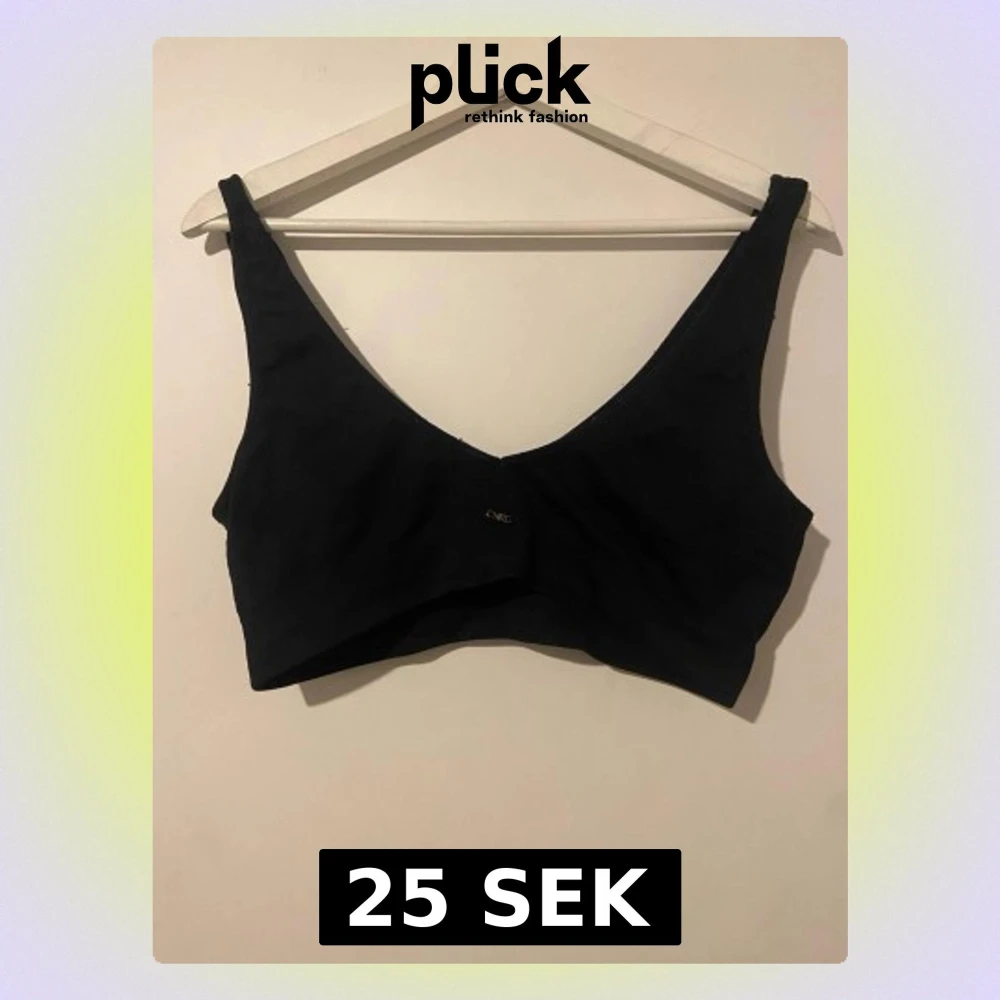Säljer en svart låg- till medelstöd sport-BH med djup v-ringning och breda axelband med ett stretchig material. . Passar dig som vanligtvis har S eller M även L.