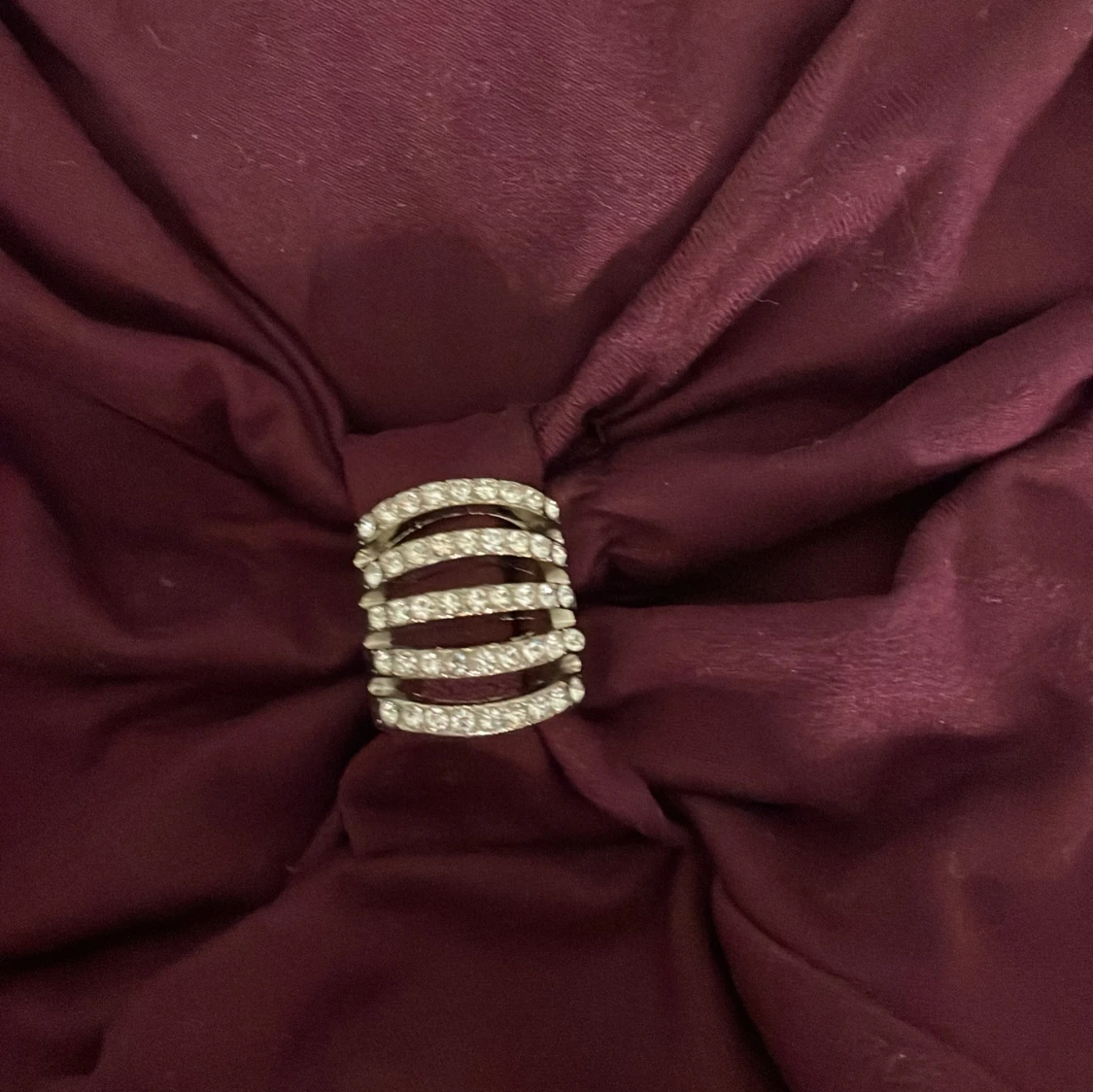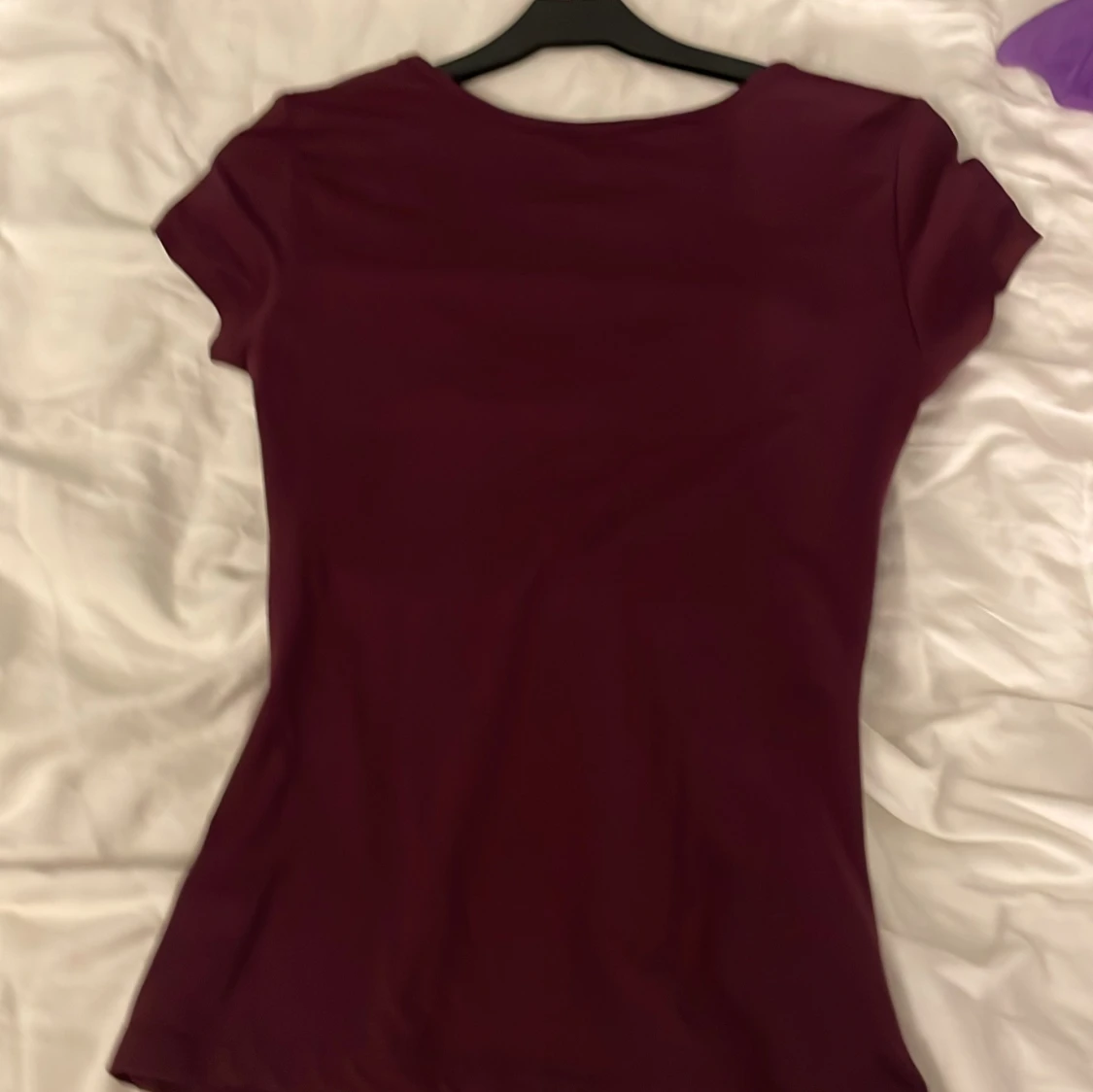 Snygg vinröd/ lila topp med korta ärmar och en glittrig silverfärgad detalj framtill som samlar tyget. Toppen har en feminin v-ringad form och är figurnära. Materialet känns mjukt och stretchigt, troligen polyester. Perfekt för att sticka ut med lite extra bling. Säljer eftersom att den inte kommer till användning. Tröjan säljs inte längre.