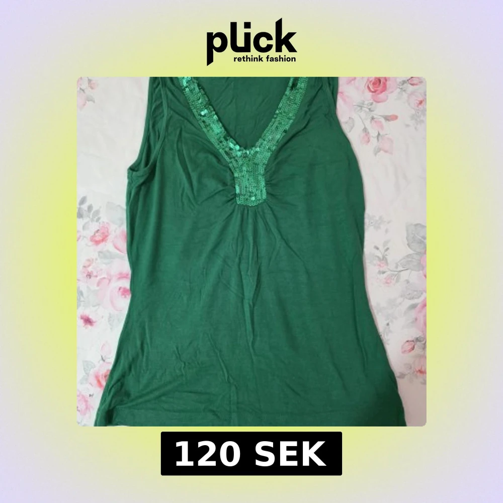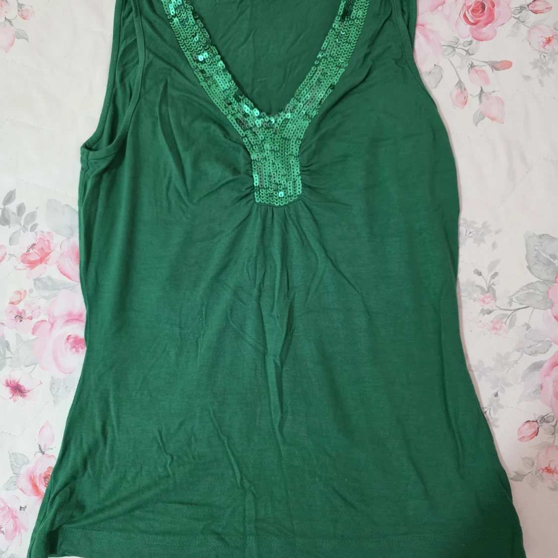 Snygg grön ärmlös topp med djup v-ringning dekorerad med gröna paljetter. Perfekt för att piffa upp din outfit med lite extra glans. Mjuk och skön att bära.
