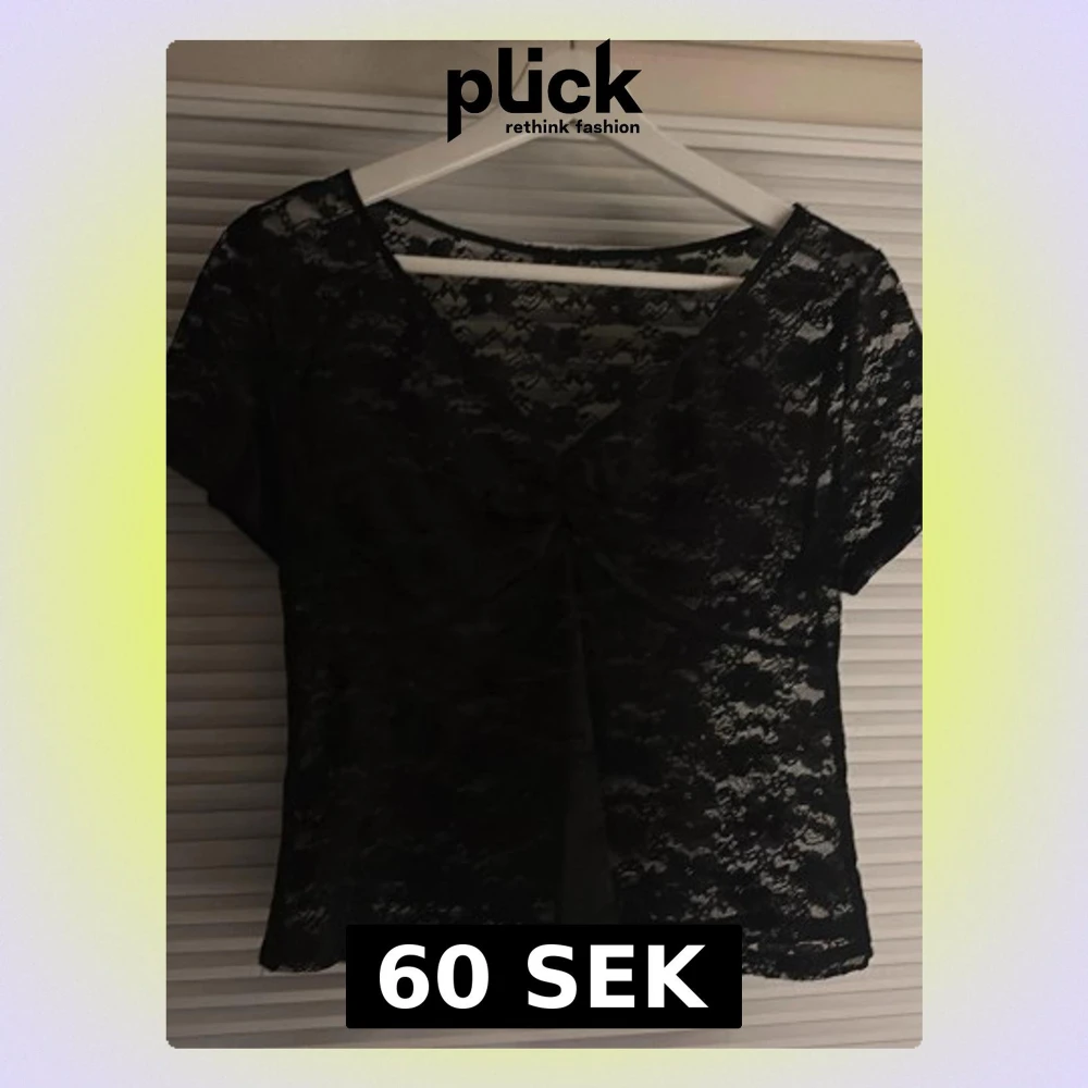 Säljer en svart topp i spets med v-ringning och korta ärmar. Toppen har ett snyggt rynkat parti framtill och är helt genomskinlig med blommigt spetsmönster. Perfekt för att skapa en cool och trendig look.