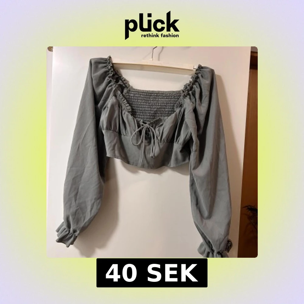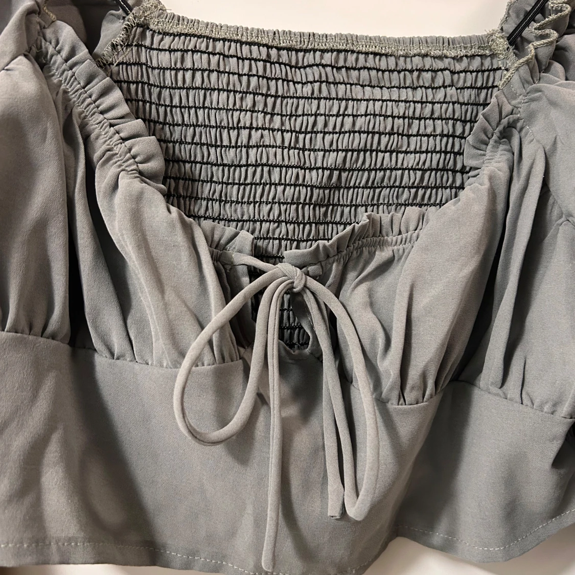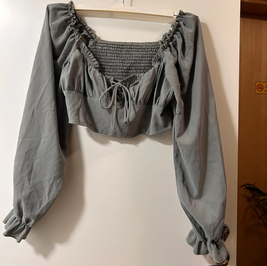 Supersöt grå croppad blus med långa puffärmar och smockad överdel. Toppen har volangkant vid halsringningen och en snygg knytning framtill. Perfekt för dig som gillar romantisk och trendig stil.