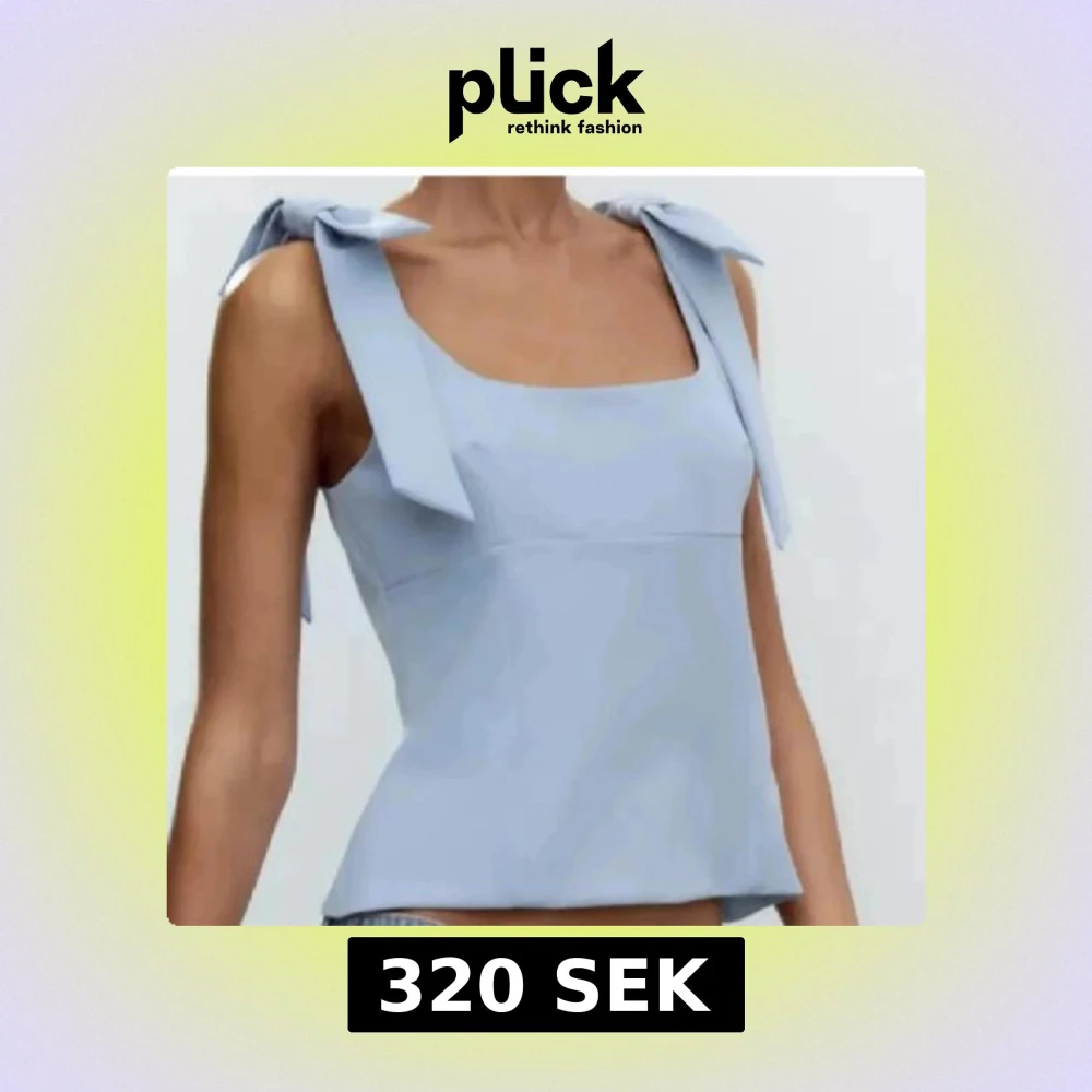 Superfin ljusblå linnetopp med breda axelband som knyts i stora rosetter på axlarna. Toppen har en fyrkantig urringning och är lätt utsvängd nedtill. Perfekt för dig som gillar en söt och trendig look på sommaren.