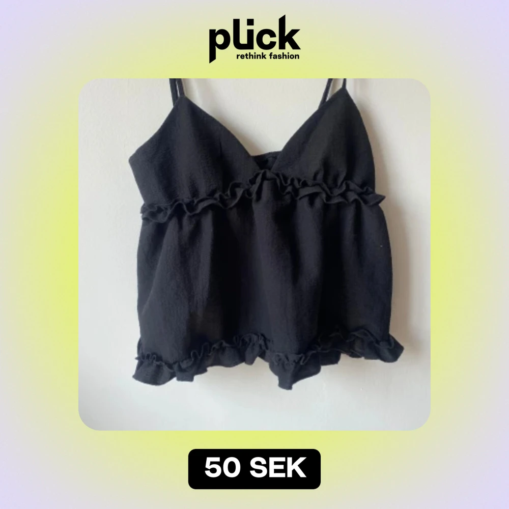 Säljer en superfin svart ärmlös topp med volanger. Den har smala axelband och en lös passform, perfekt för sommardagar eller en festkväll. Materialet känns mjukt och bekvämt.