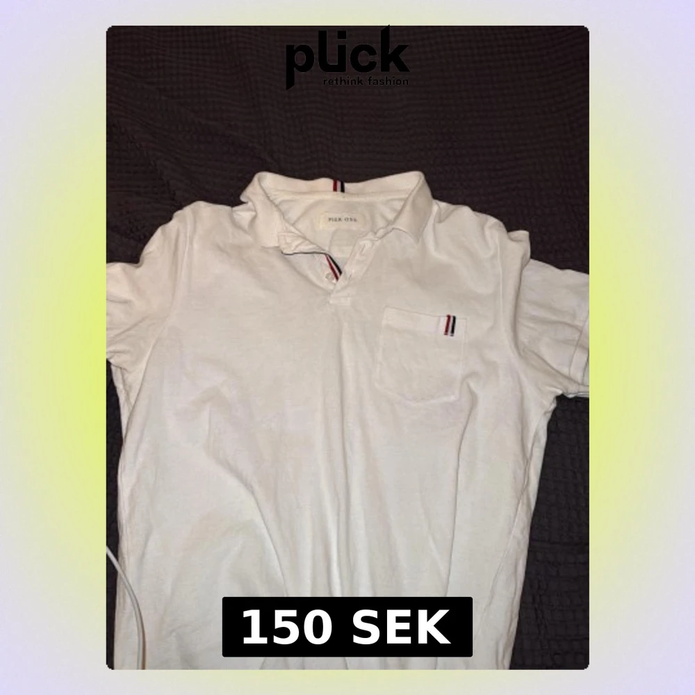 Klassisk vit pikétröja från Pier One med korta ärmar och krage. Tröjan har en liten bröstficka med diskret randig detalj i rött och blått samt knappslå framtill. Perfekt till jeans eller shorts för en clean look.