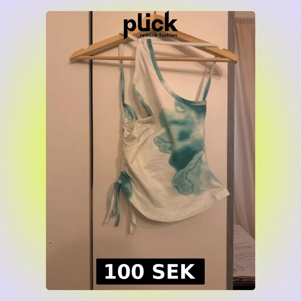 Trendig linnetopp i vitt med turkosa mönster och snygga knytband i sidan och en matchade kjol. Toppen har smala axelband och är ärmlös, perfekt för varma dagar. Materialet känns mjukt och lätt, troligen bomull eller polyester. Snygg detalj med rynk och knyt i sidan för justerbar passform.