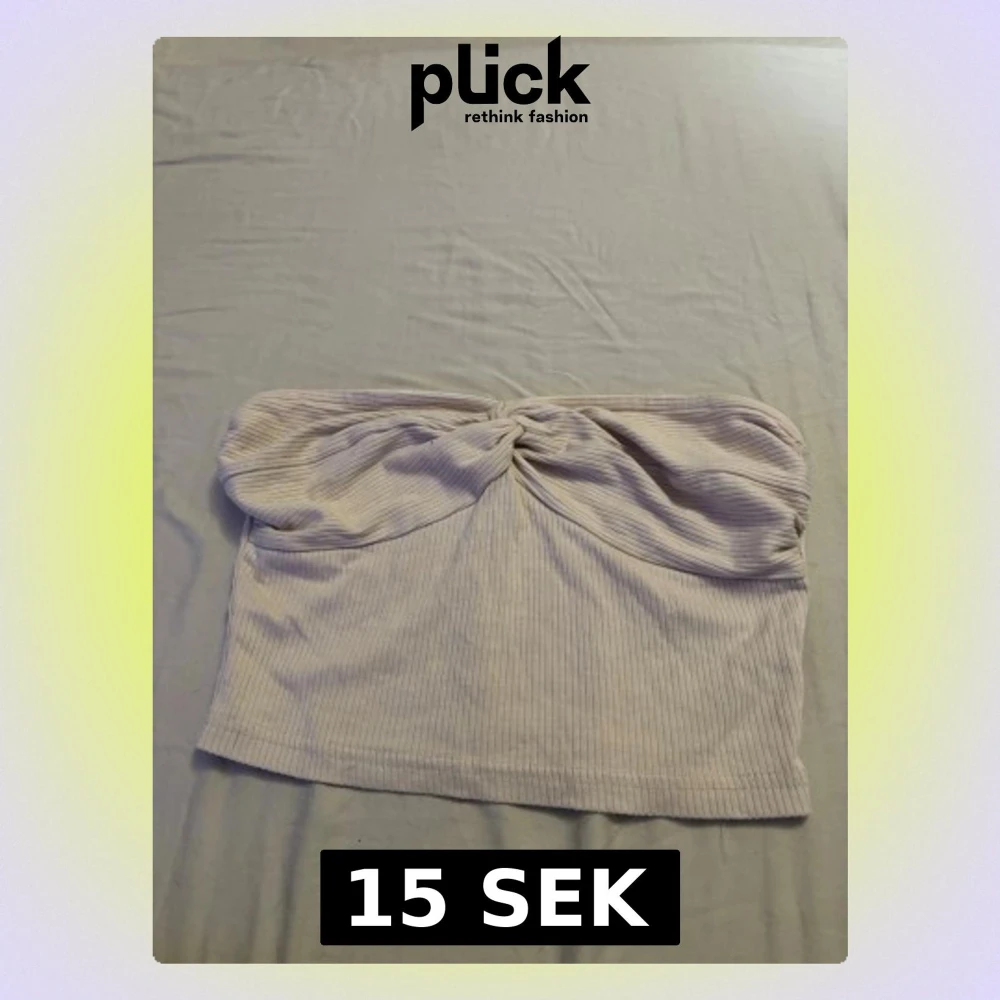 Trendig ljusbeige tubtopp i ribbat material med snygg twistdetalj framtill. Toppen är axelbandslös och har en croppad passform som passar perfekt till höga jeans eller kjol. Säljer denna pågrund av av den inte kommer till användning