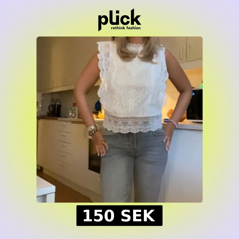 Säljer en vacker vit spetsblus med volangdetaljer. Blusen är ärmlös och har en fin, broderad design med en rak passform. Perfekt för en somrig look!
