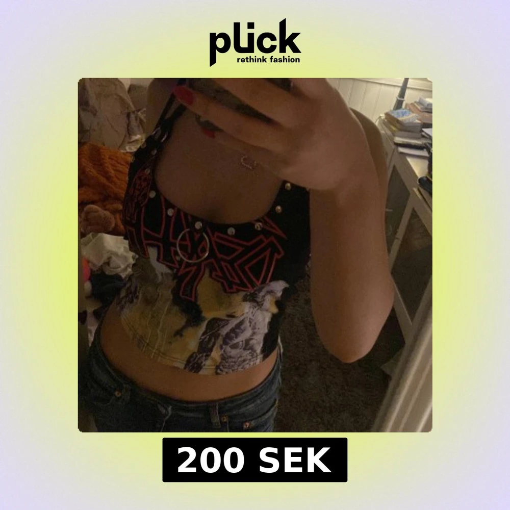 Coolt svart linne med tryck av skelett och text i rött. Toppen har nitar längs axelbanden och en ringdetalj framtill. Perfekt för en edgy look! Från bandet ”Death”