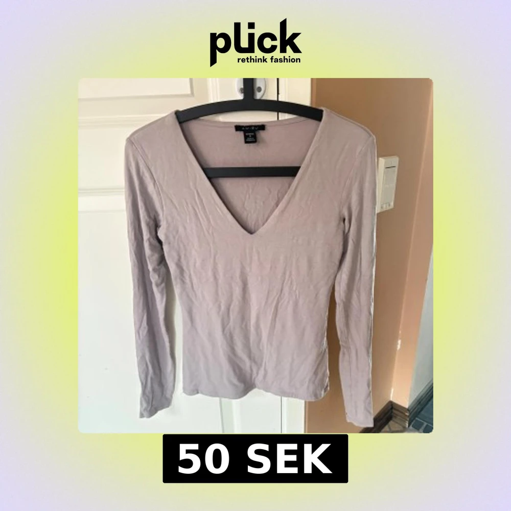 Säljer en långärmad topp från Amisu med djup v-ringning. Toppen är figurnära och har en enkel, stilren design. Lite lila/grå i färgen.