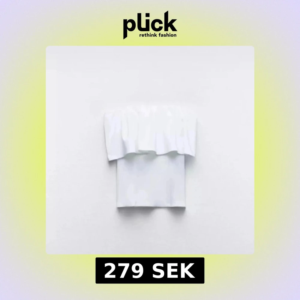 Supersnygg vit bandeau tubtopp med bred volang upptill som ger en cool och trendig look. Toppen är axelbandslös och har en clean, stilren design som passar perfekt till sommarens outfits. Materialet känns mjukt och följsamt mot huden.