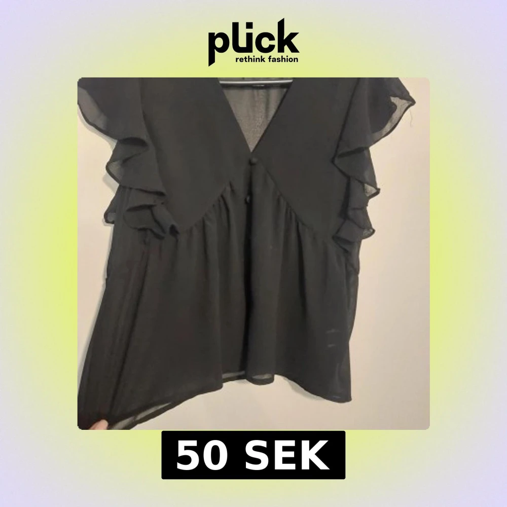 Säljer en svart blus med v-ringad hals och snygga volangdetaljer på ärmarna. Blusen är gjord i ett lätt och transparent material som ger en luftig känsla. Perfekt för dig som gillar en stilren look med lite extra edge. Passar till både jeans och kjol.