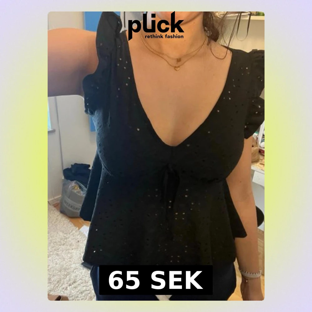 Säljer en svart blus med v-ringning, volangärmar och dekorativt knyt under bysten. Blusen har broderade hål och är tillverkad i ett lätt tyg som ger en luftig känsla. Perfekt för dig som gillar feminina detaljer och en trendig look.
