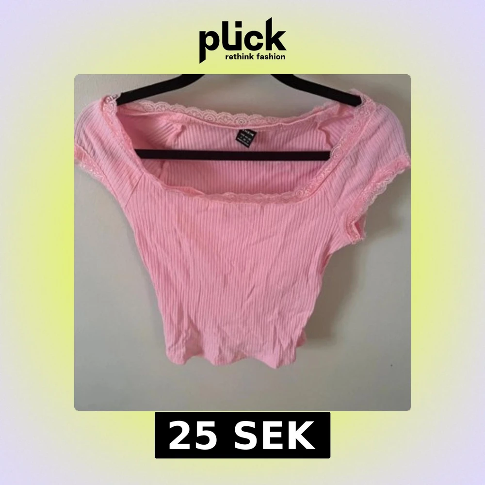 Söt ljusrosa croppad topp från Shein med ribbad struktur och spetsdetaljer längs halsringning och ärmslut. Aldrig använd