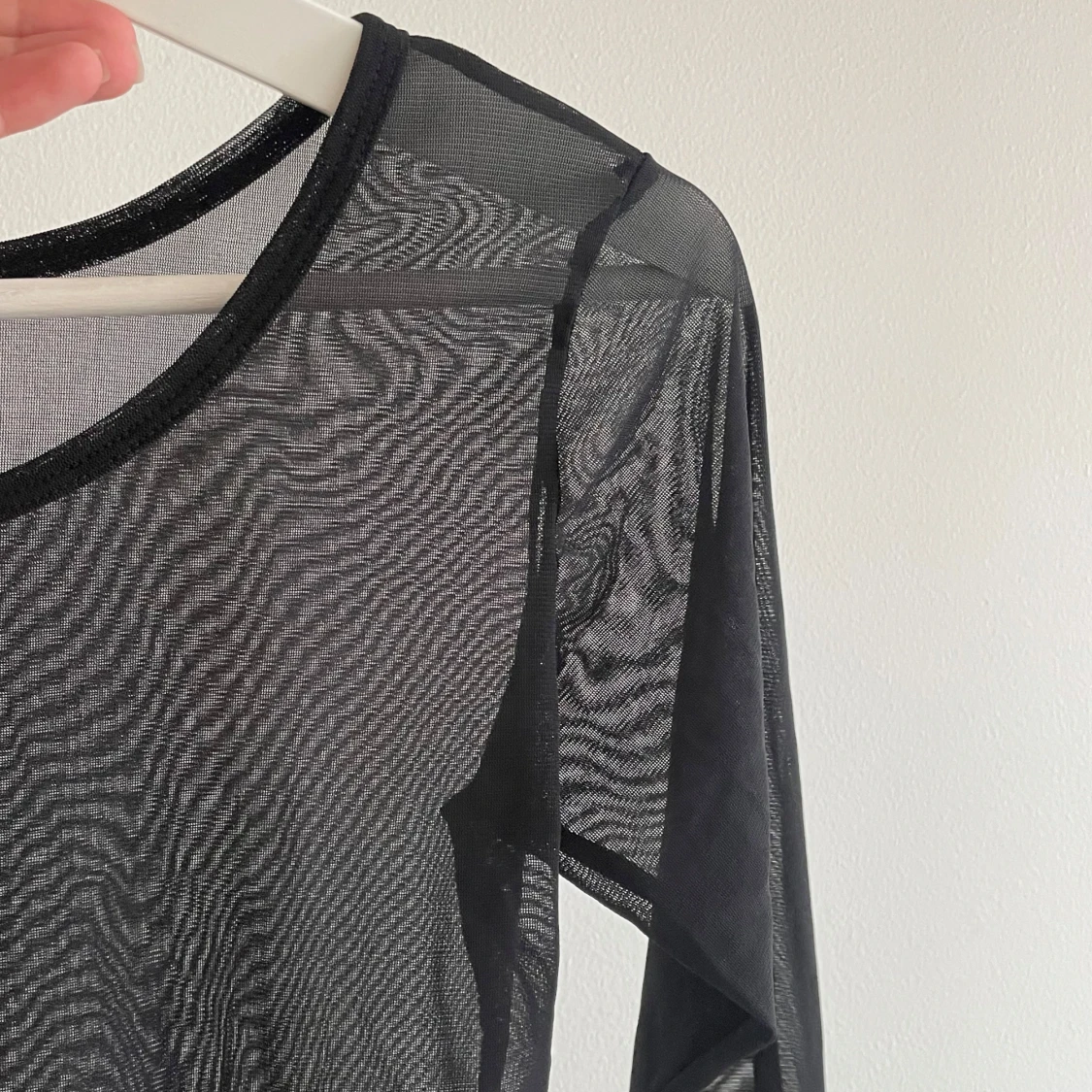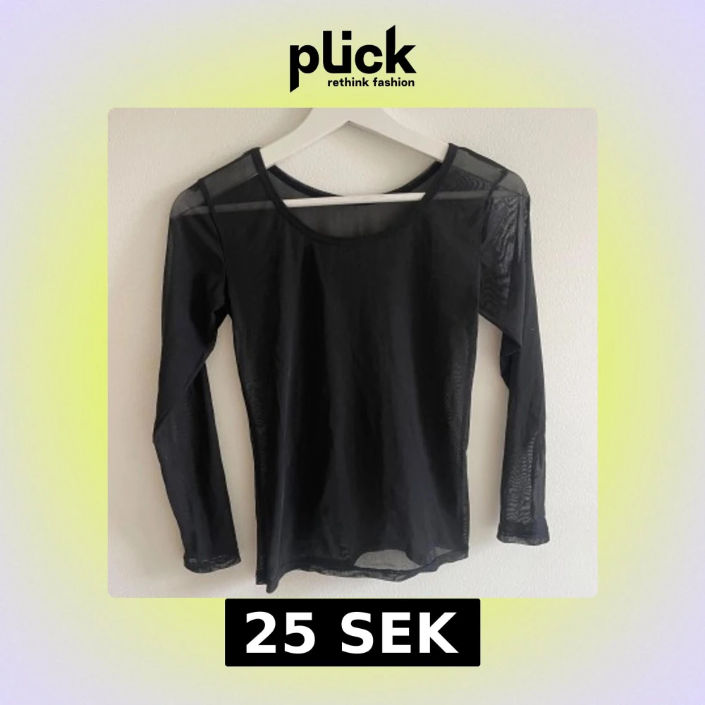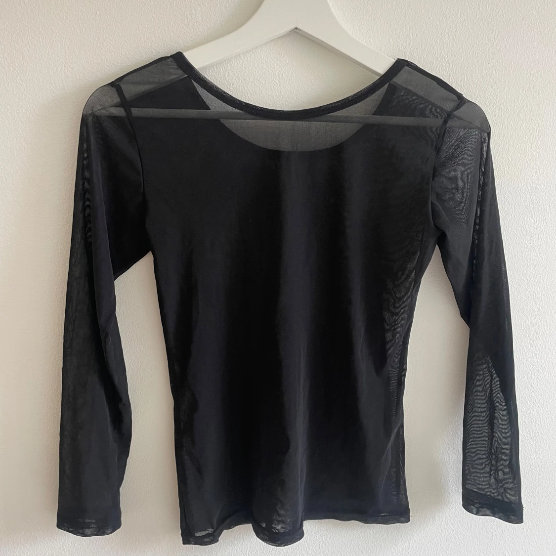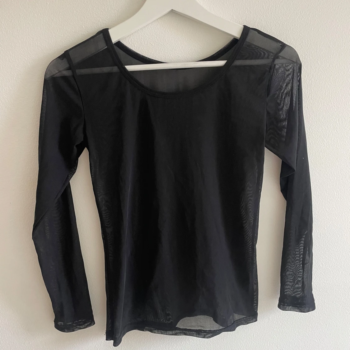 Obs saknas storlekslapp men skulle uppskatta den till storlek S. Säljer en svart långärmad mesh topp med rund hals. Tunn och transparent, perfekt för lager-på-lager eller att styla med coola accessoarer. Materialet är syntet och ger en edgy vibe. Passformen är normal och toppen är helt utan mönster eller detaljer.
