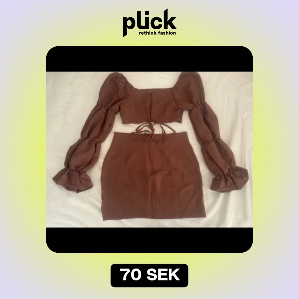 Säljer ett snyggt brunt set med en croppad topp och matchande kjol. Toppen har långa puffärmar och knytning fram, vilket ger en trendig look. Kjolen är tight och kort, perfekt för en utekväll eller fest. Materialet känns mjukt och bekvämt. Passar perfekt för höst och vår!