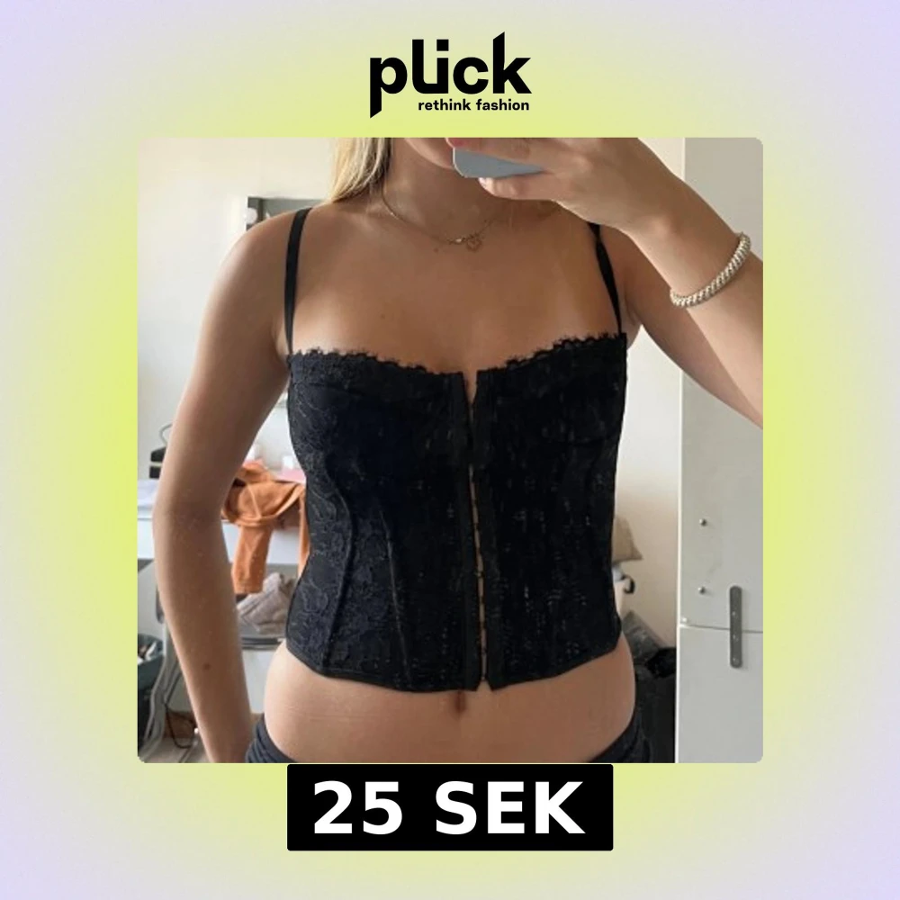 Säljer en svart korsett med tunna axelband, spetsdetaljer och hakknäppning framtill. Endast använd 2 gånger! Storlek S men liten i storleken, mer som xs