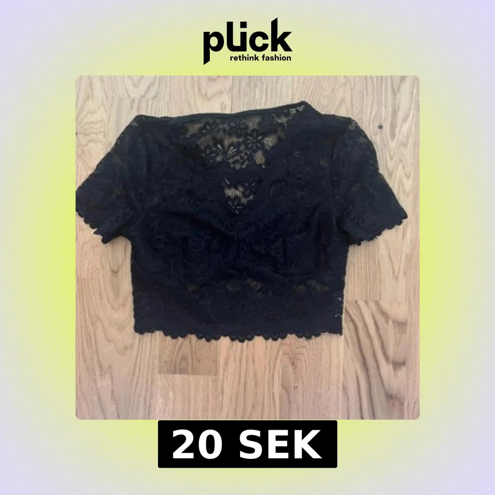 Säljer en svart croppad blus i spets med blommigt mönster. Toppen har korta ärmar, v-ringning och fina vågiga kanter nertill. Perfekt för dig som gillar detaljer och vill ha en snygg topp med genombruten look.