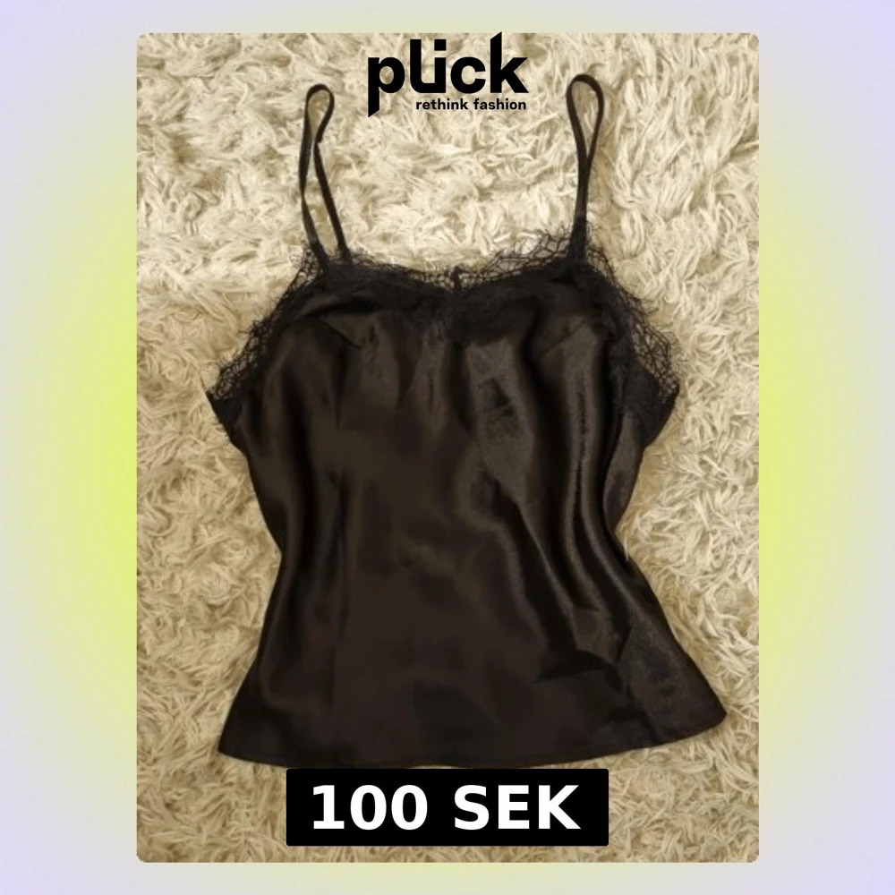 Snygg svart linnetopp i satin med tunna axelband och spetsdetaljer längs urringningen. Perfekt att styla med jeans eller kjol för en trendig look.