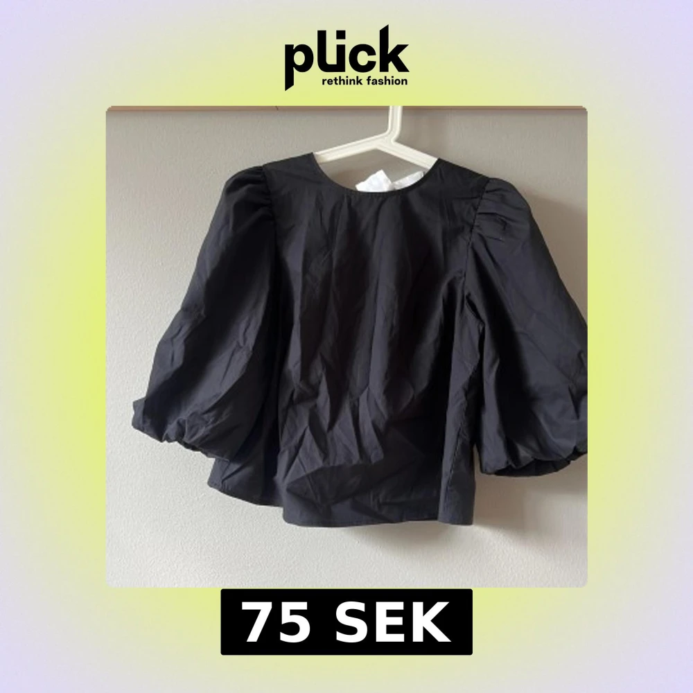 Supersnygg svart blus från Divided med stora puffärmar och rund hals. Baksidan har vita knytband som ger en cool kontrast och unik look. Blusen är croppad och har en lätt glansig finish, perfekt för dig som gillar statement-plagg.