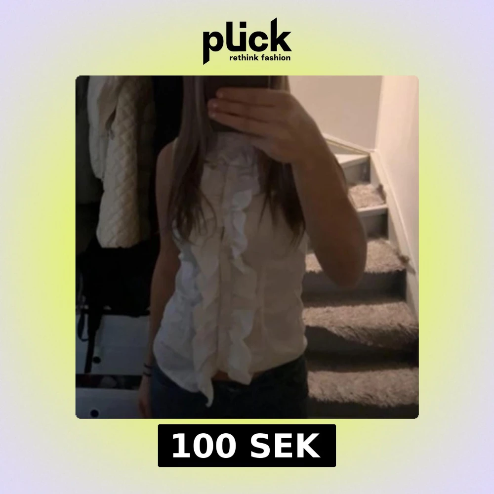Supersöt vit blus med volangdetaljer längs hela framsidan. Ärmlös modell med hög hals och lätt figursydd passform. Perfekt för dig som gillar en romantisk och trendig look.
