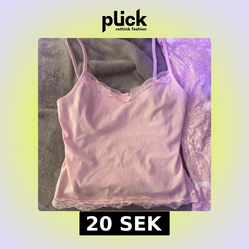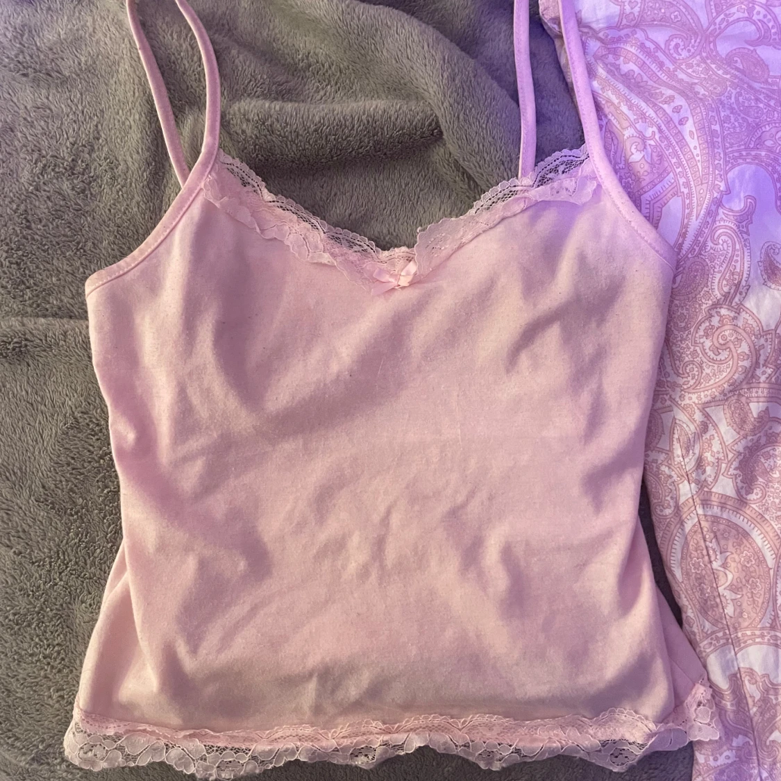 Söt rosa linnetopp med smala axelband och spetsdetaljer vid halsringning och nederkant. Perfekt för varma dagar eller som ett lager under en tröja.