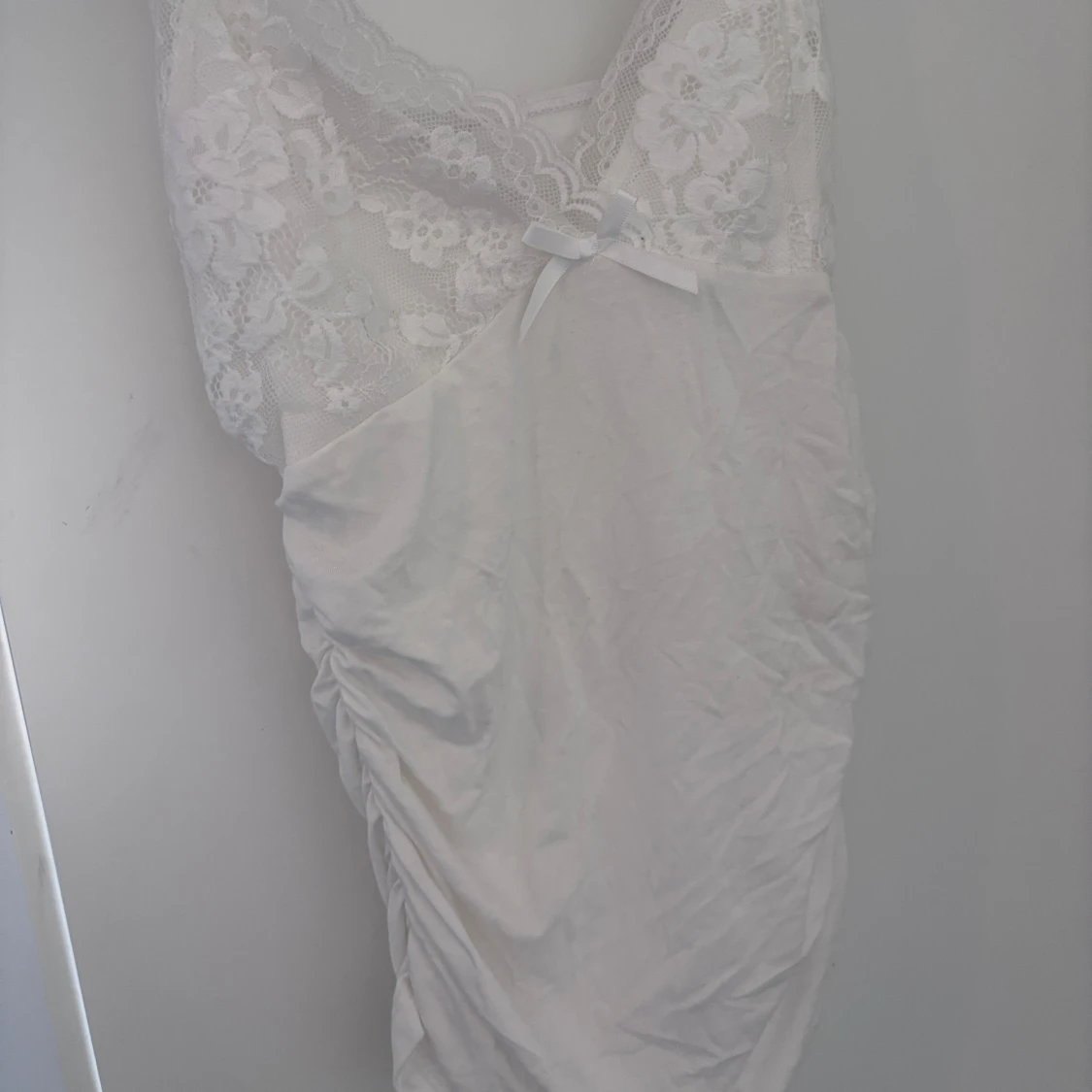 Supersöt vit linne med spets upptill och liten rosett vid bysten. Linnet har v-ringning, blommigt spetsmönster och är ärmlös. Perfekt för dig som gillar romantisk och feminin stil.