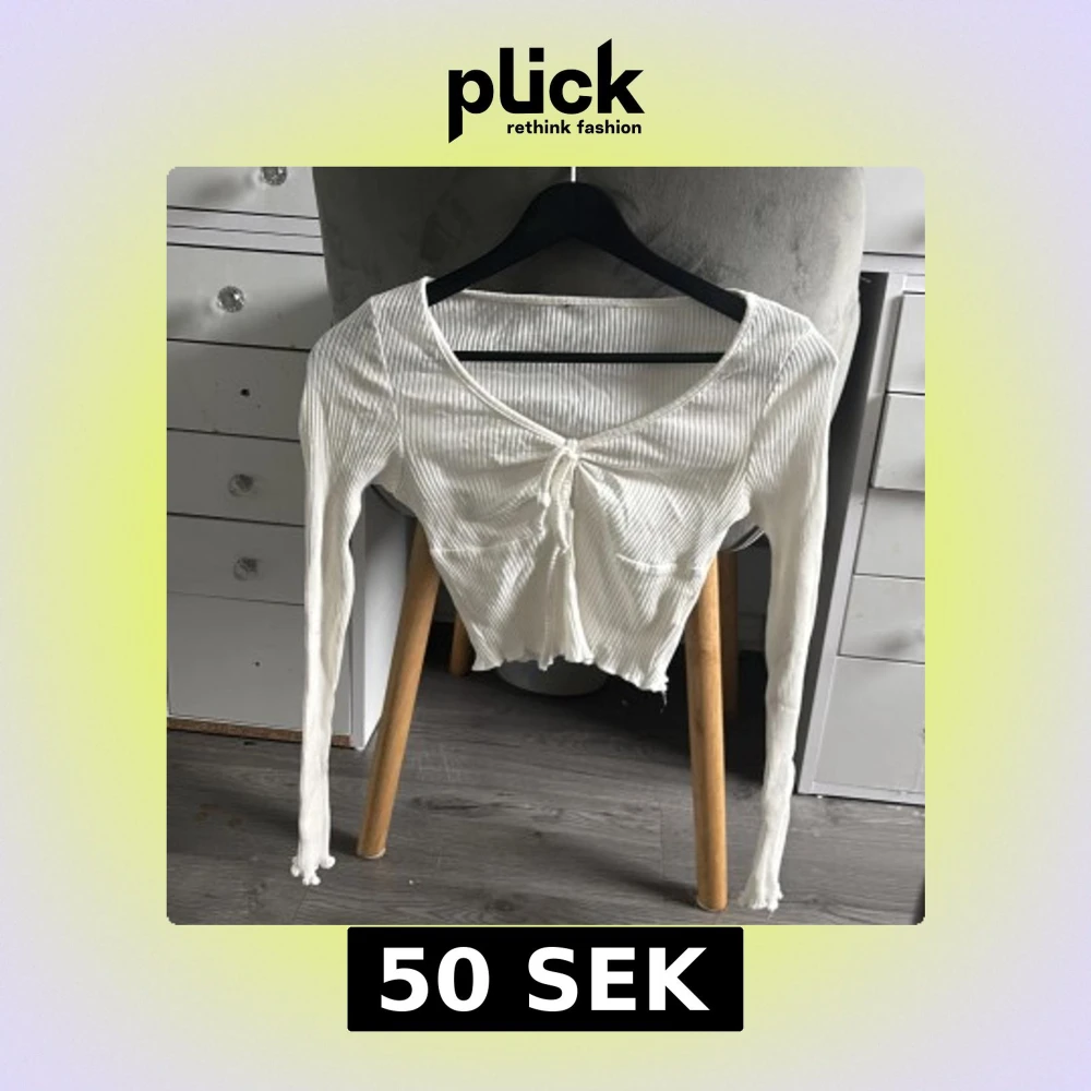 Säljer en vit ribbad långärmad topp med croppad passform och snörning framtill. Toppen har v-ringning och lätt vågig kant nertill för en trendig look. Perfekt för dig som gillar stilrena och enkla plagg med en twist.