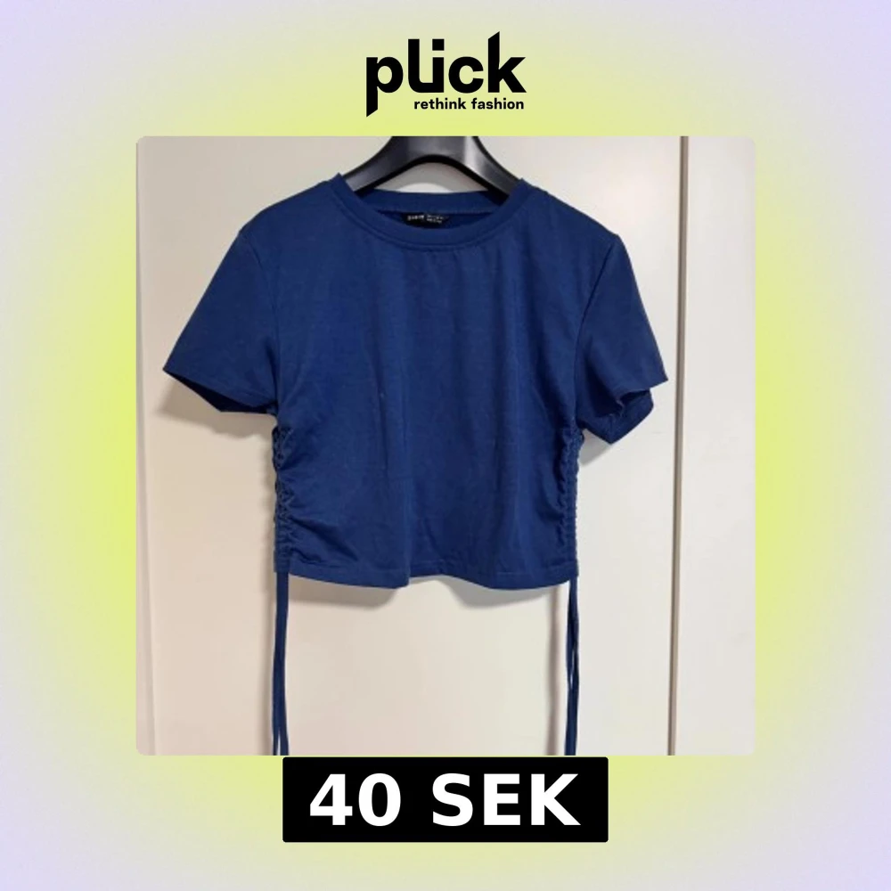 Säljer en marinblå croppad topp från SHEIN med korta ärmar och snörning på sidorna. Enkel och stilren design i mjuk bomull, perfekt för att skapa en chill och trendig look. Passar dig som gillar att styla med jeans eller kjol.