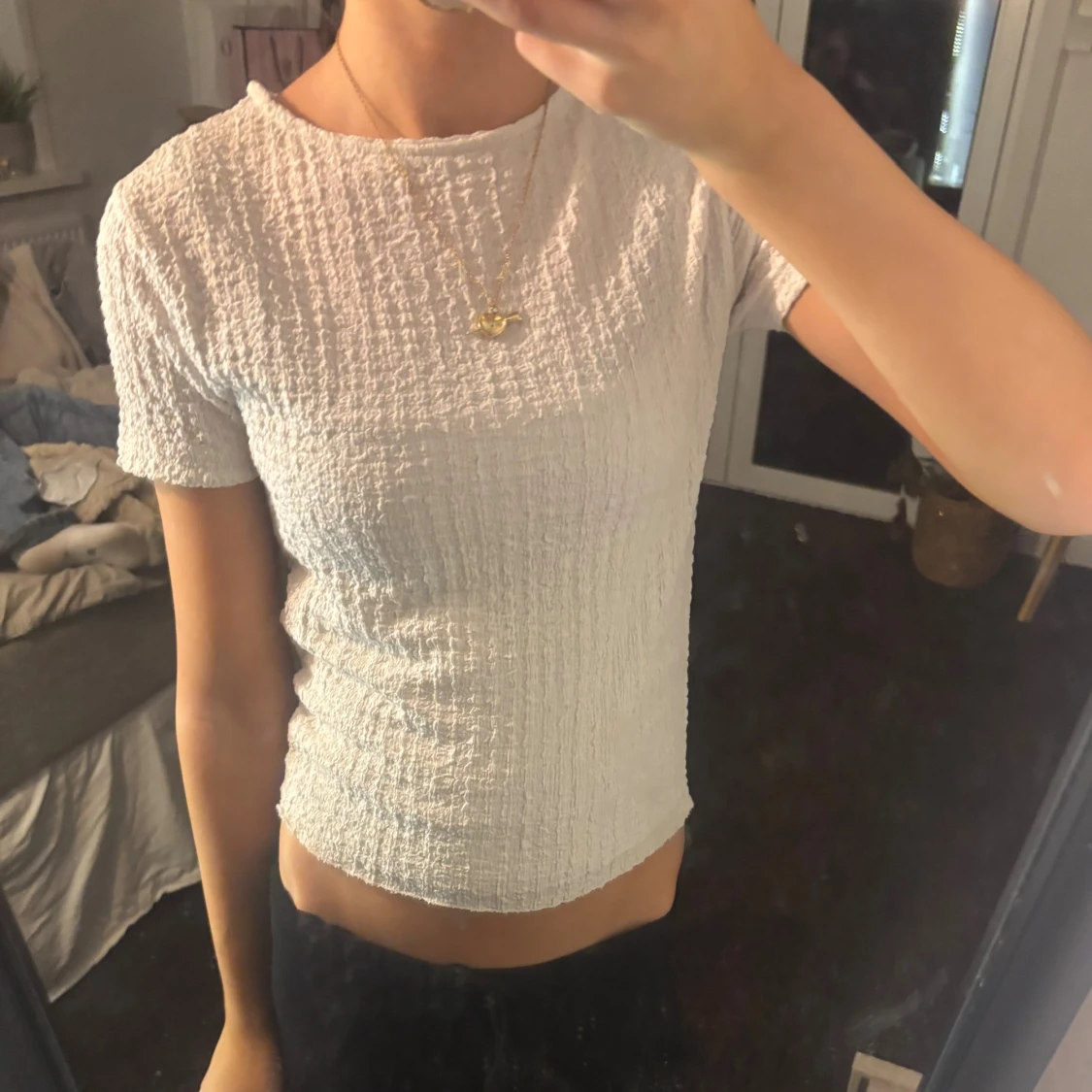 Säljer en vit ribbad topp med korta ärmar och rund hals. Toppen har en croppad passform och är tillverkad i ett stretchigt material som sitter snyggt på kroppen. Perfekt för dig som gillar en enkel men stilren look.