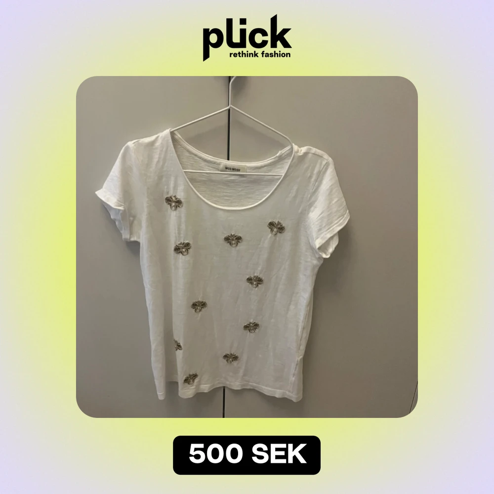 Säljer en snygg vit t-shirt från Mos Mosh med små broderade detaljer framtill. T-shirten har en rund hals och korta ärmar. Nypris: 650kr