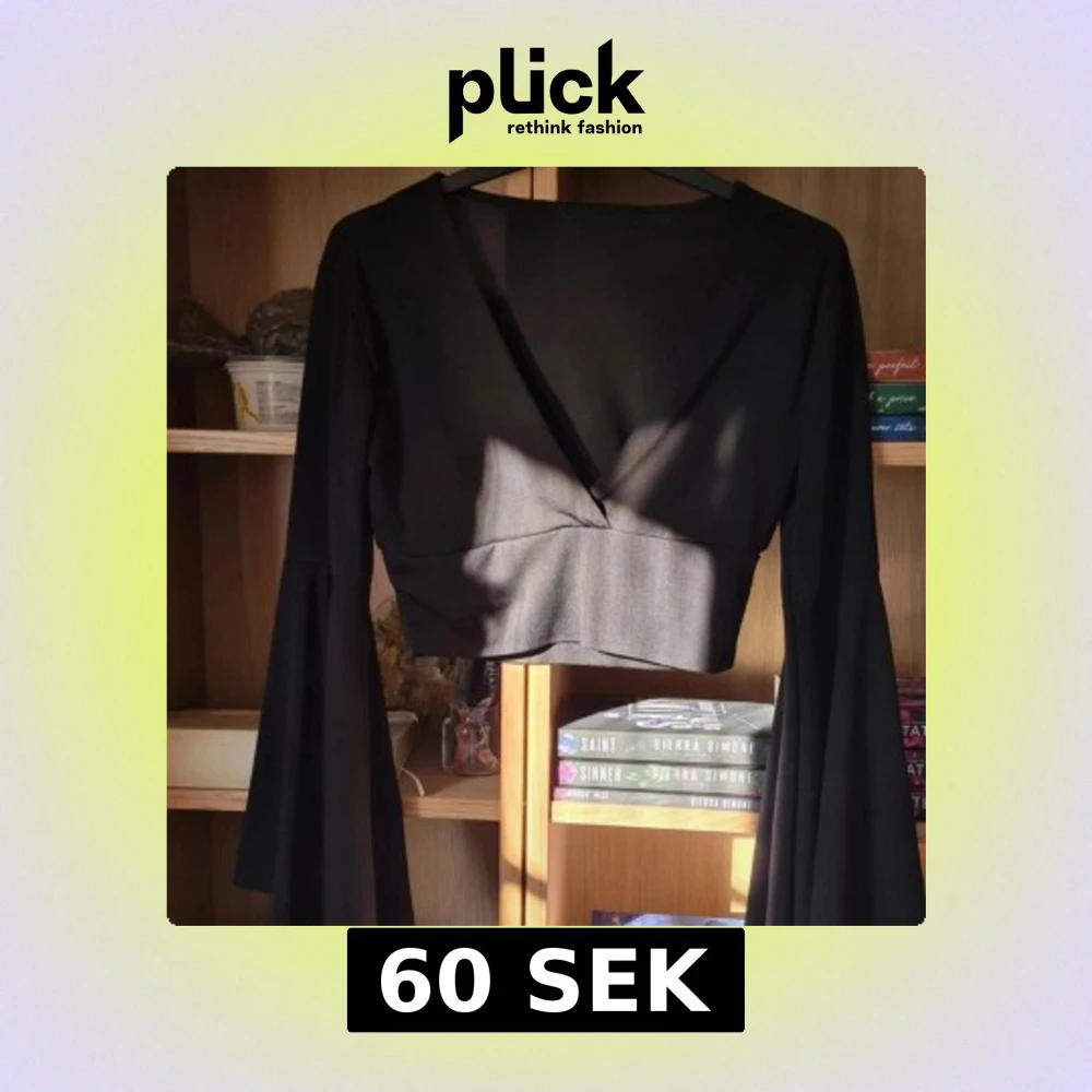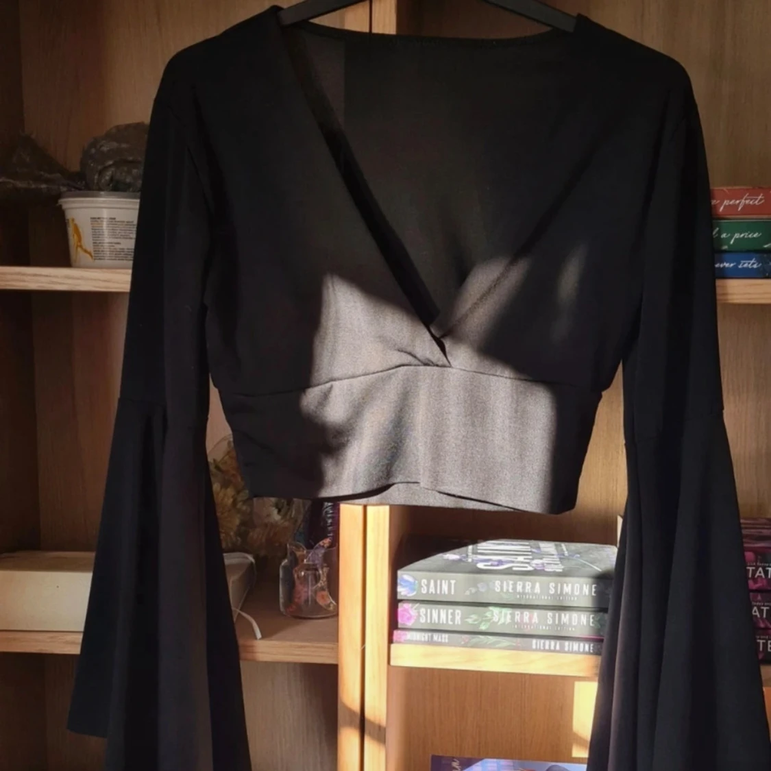 Säljer en svart croppad topp med djup v-ringning och långa, vida trumpetärmar. Toppen har en figurnära passform och är tillverkad i ett stretchigt syntetmaterial. Perfekt för att skapa en trendig och stilren look. Nypris: 129kr Alla kläder rollas innan de skickas då katt finns i hemmet!🐈