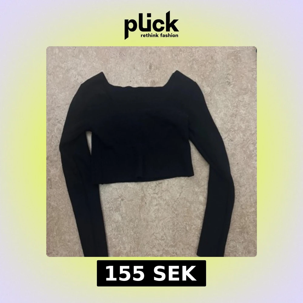 Säljer en svart croppad topp med lång ärm och fyrkantig halsringning. Toppen är ribbad och har en tight passform som framhäver siluetten. Perfekt att styla med höga jeans eller kjol för en trendig look. Aldrig använd för kort i min smak