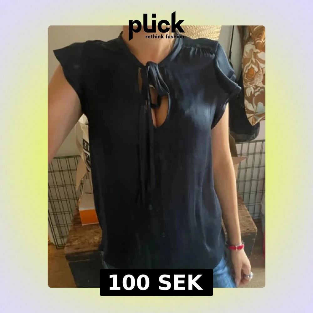 Säljer en marinblå blus med korta ärmar och snygg knytning vid halsen. Blusen har en lätt glansig yta och ett mjukt fall, perfekt för dig som gillar stilrena och enkla plagg med en twist. Passar till jeans eller kjol för en cool look.