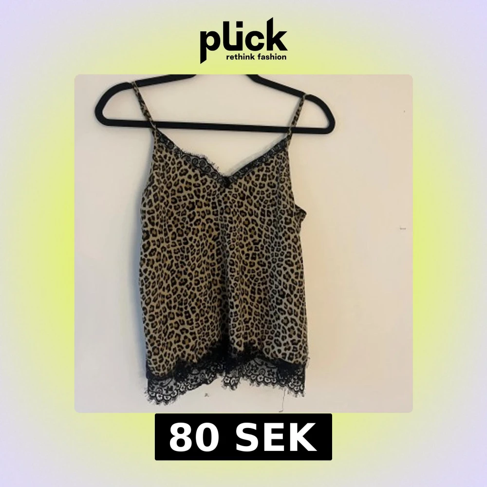 Säljer en snygg leopardmönstrad linnetopp med tunna axelband och v-ringning. Toppen har svart spetsdetalj längs halsringningen och nederkanten som ger en extra cool vibe. Materialet är mjukt och lätt, perfekt för att sticka ut i mängden.