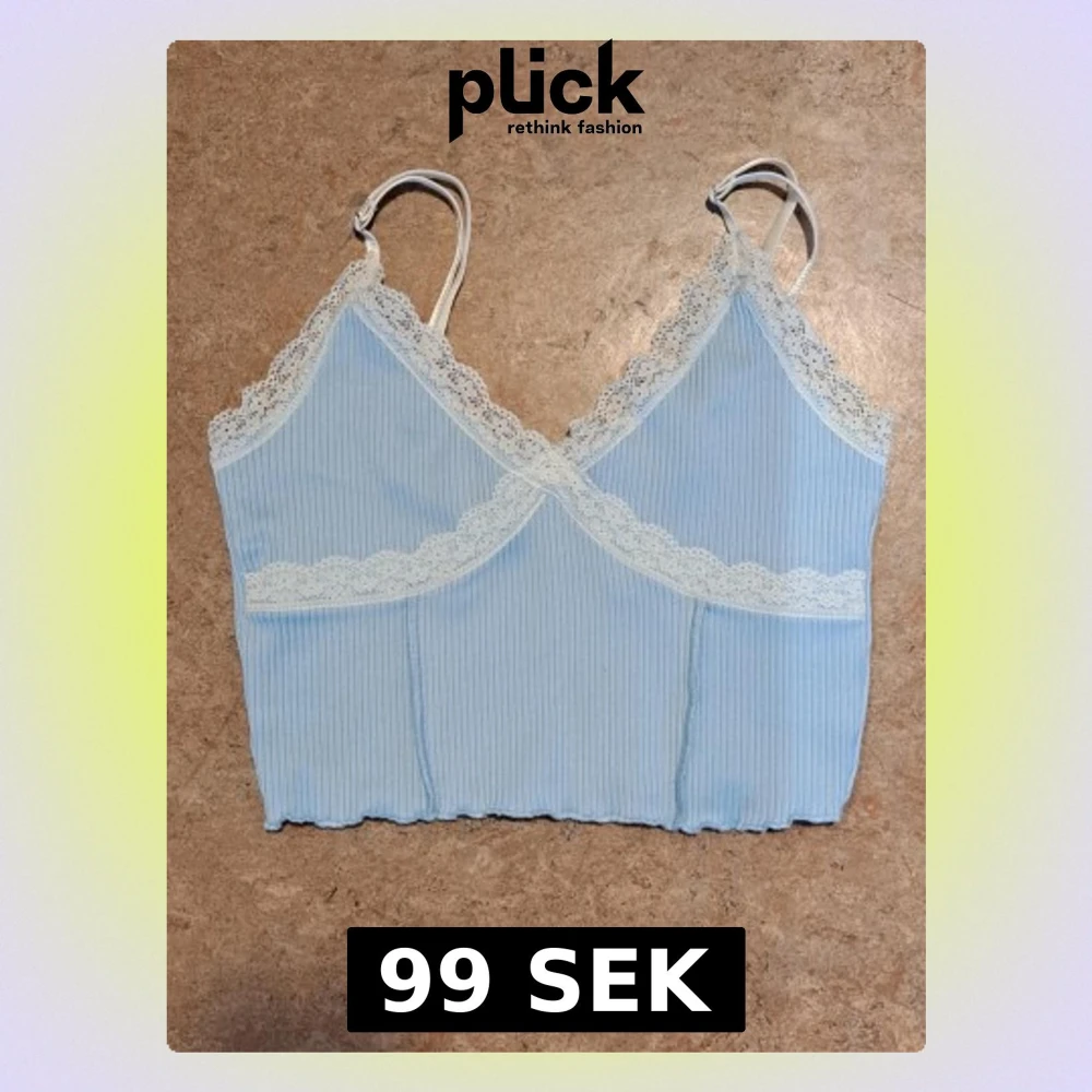Supersöt ljusblå linnetopp från H&M Divided i storlek S. Toppen har justerbara axelband och är dekorerad med vit spets.