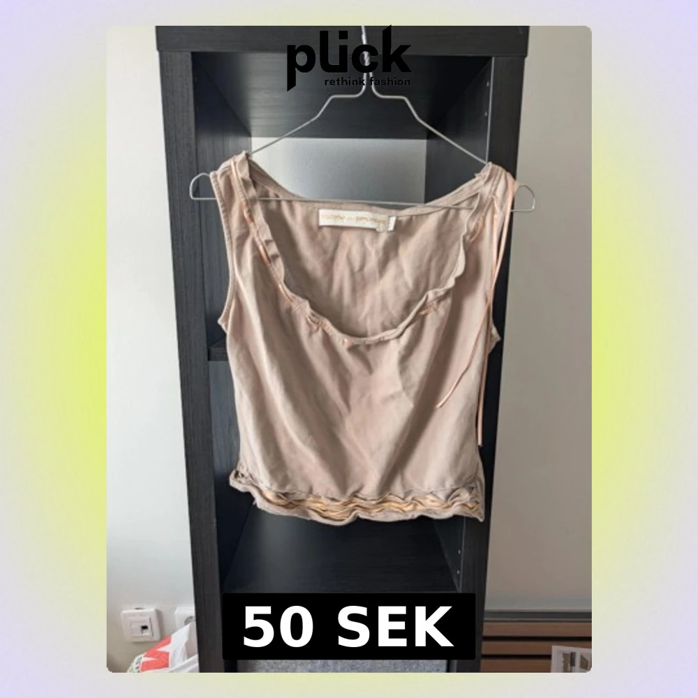 Säljer en beige linnetopp från Munthe plus Simonsen. Toppen har ärmlös design, rundad hals och dekorativa vågiga sömmar längst ner samt ett band som löper längs halsringningen. Perfekt för dig som gillar stilrena och unika detaljer.
