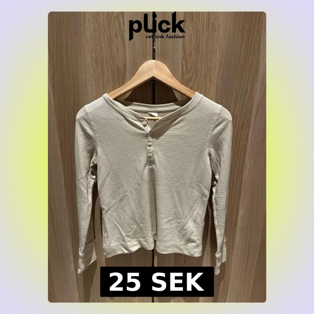 Säljer en beige långärmad topp i ribbad bomull med fyra knappar framtill. Toppen har en enkel och clean look med rundad halsringning och smal passform. Perfekt att styla med jeans eller kjol för en chill vibe.