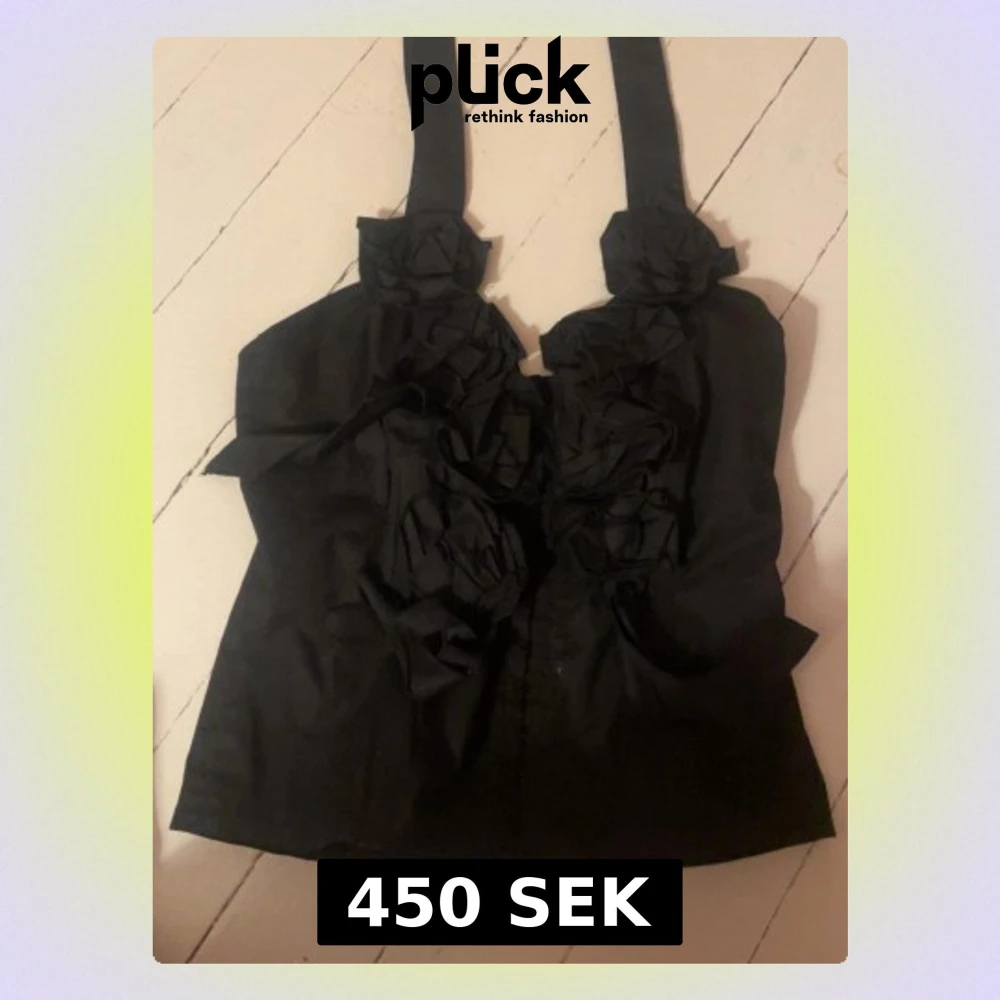 Säljer en svart korsettopp från Lissa med breda axelband och dekorativa tygrosetter framtill. Toppen har hakar längs framsidan och är tillverkad i ett glansigt syntetmaterial som ger en cool look. Perfekt för dig som gillar statement-plagg och vill sticka ut.