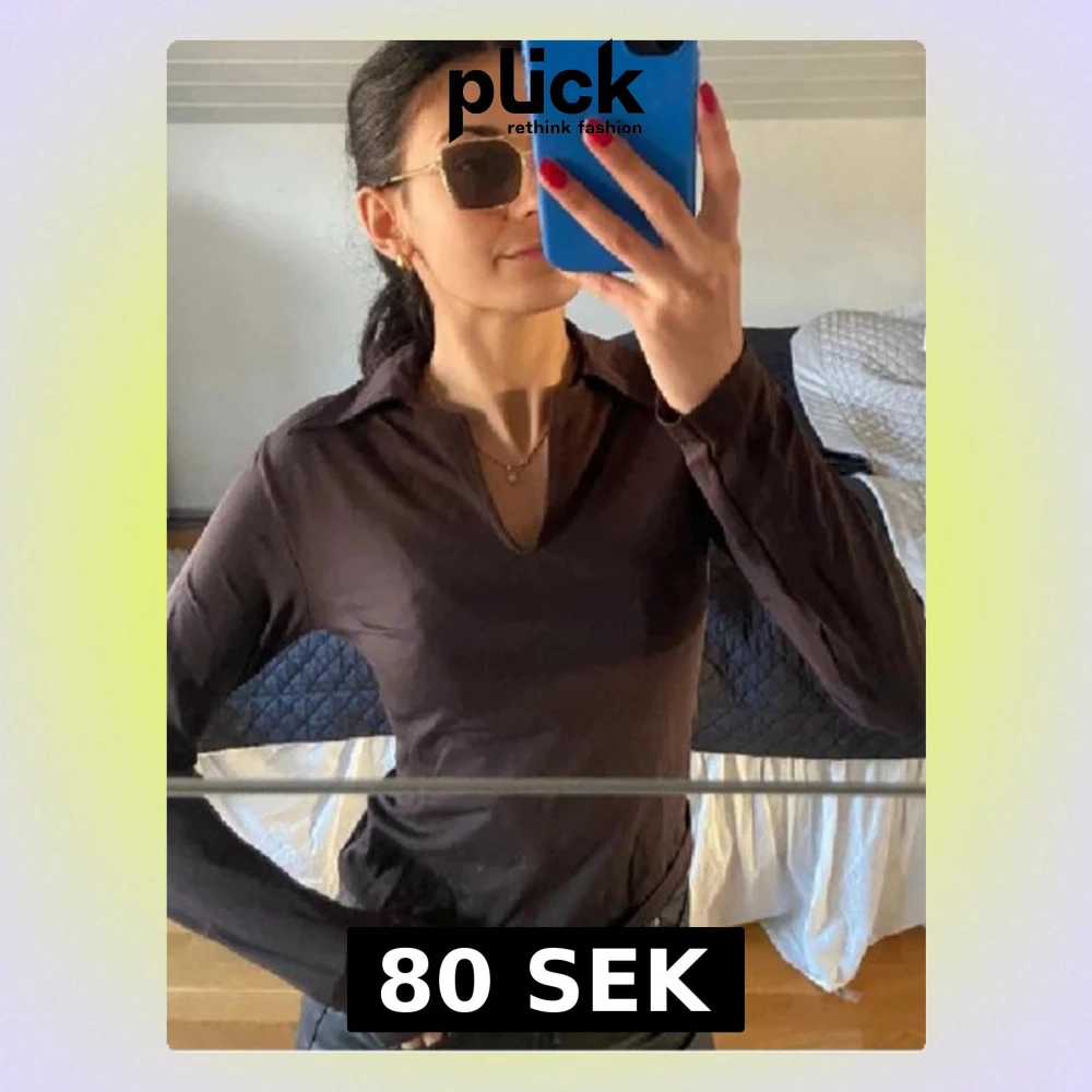 Säljer en brun långärmad polotopp med krage och v-ringning. Toppen har en slim passform och är tillverkad i ett mjukt material som sitter snyggt på kroppen. Perfekt att styla med jeans eller kjol för en trendig look.