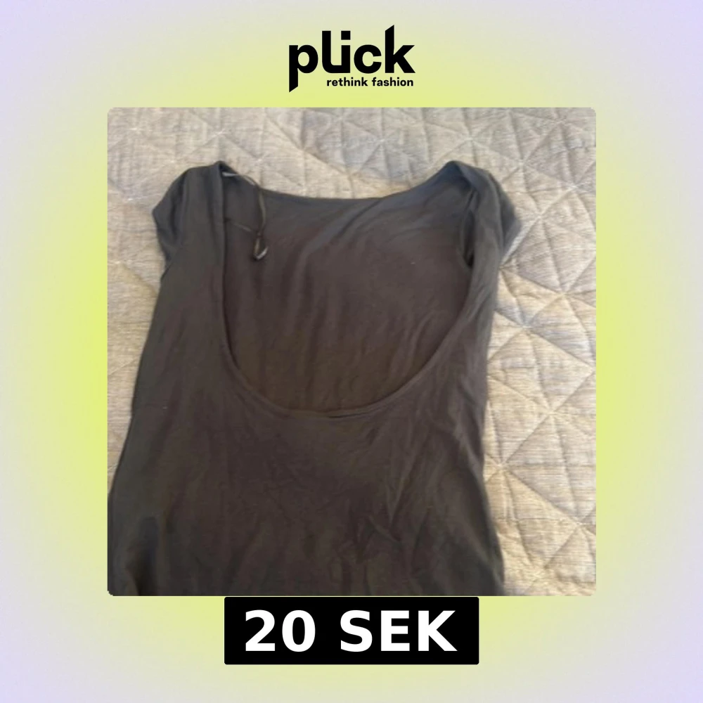 En mörkgrå, enkel linnetopp med djup rund öppen rygg. Toppen är kort T-shirt ärmad och har en smal passform som sitter snyggt mot kroppen. Materialet känns mjukt och stretchigt, perfekt för att matcha med jeans eller kjol. Stilren och lätt att styla.