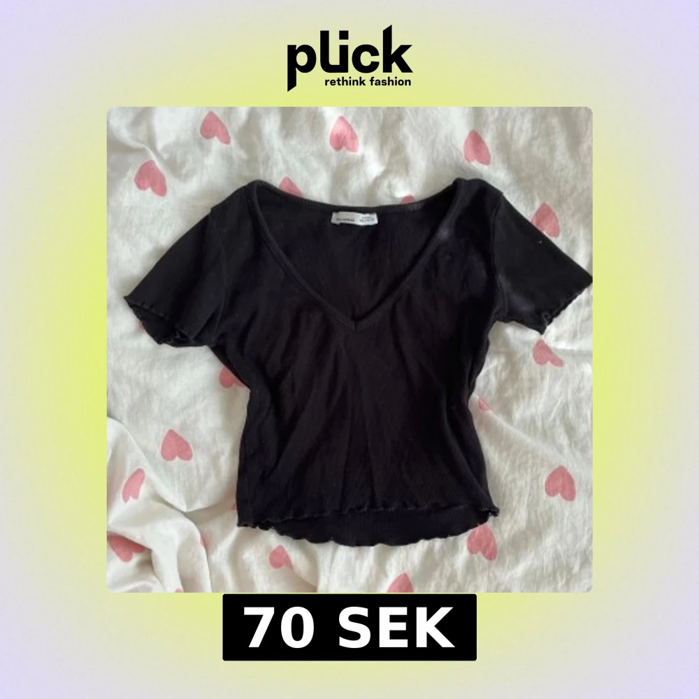 Svart ribbad croppad topp från Pull & Bear i strl S med v-ringad hals. Kortärmad och figurnära passform!💞