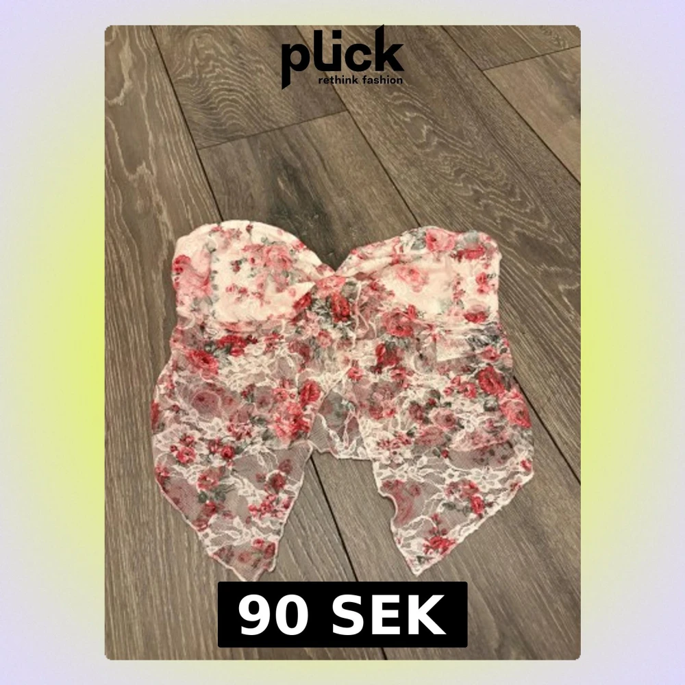 Säljer en romantisk tubtopp från SHEIN i storlek S. Toppen är blommig med rosa, röda och gröna toner på vit spets. Modellen är bandeau och har transparent spets med blommönster och snygga spetskanter framtill och baktill. Perfekt för att skapa en söt och trendig look.
