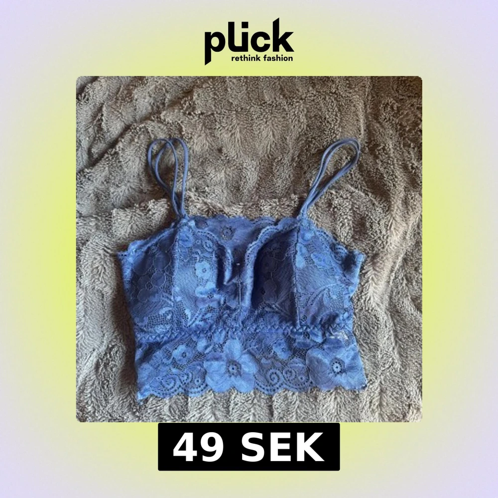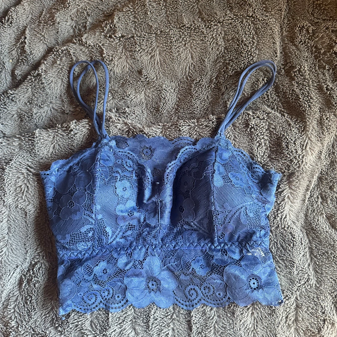 Supersöt blå linnetopp i spets med blommigt mönster och tunna axelband. Toppen är croppad och har fina vågiga kanter nertill. Perfekt för dig som gillar romantisk och feminin stil.