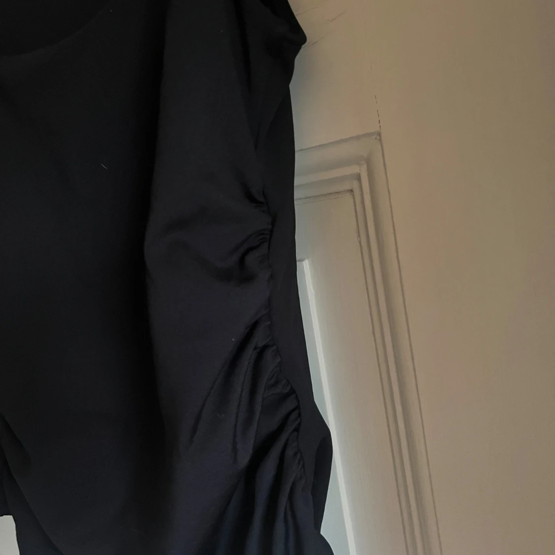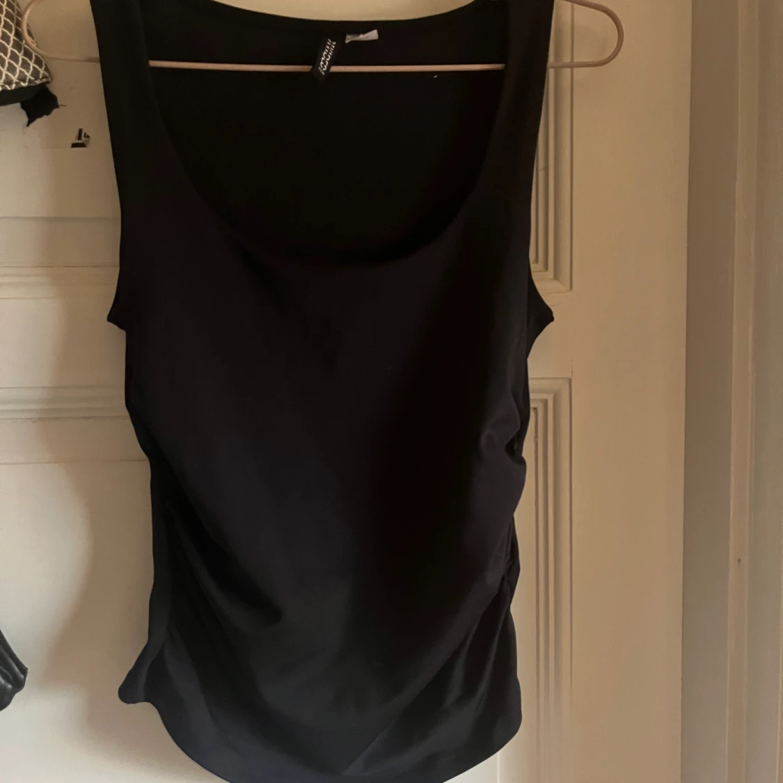 Svart ärmlös linnetopp från H&M Divided i storlek S. Toppen har en rundad urringning och snygga rynkade detaljer längs sidorna som ger en cool twist. Perfekt att styla med jeans eller kjol för en enkel men trendig look.