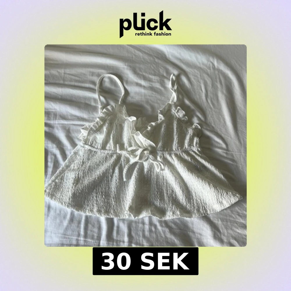 Supersöt vit linnetopp med smala axelband, volangdetaljer längs urringningen och en liten knytning framtill. Toppen har en lätt skrynklig struktur och är luftig med en flowy passform, perfekt för varma dagar.