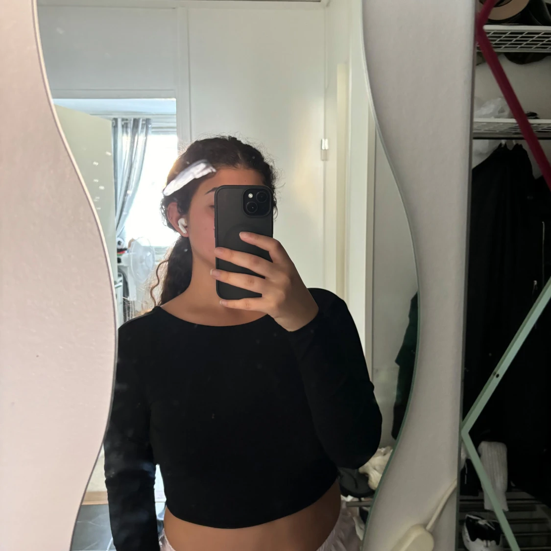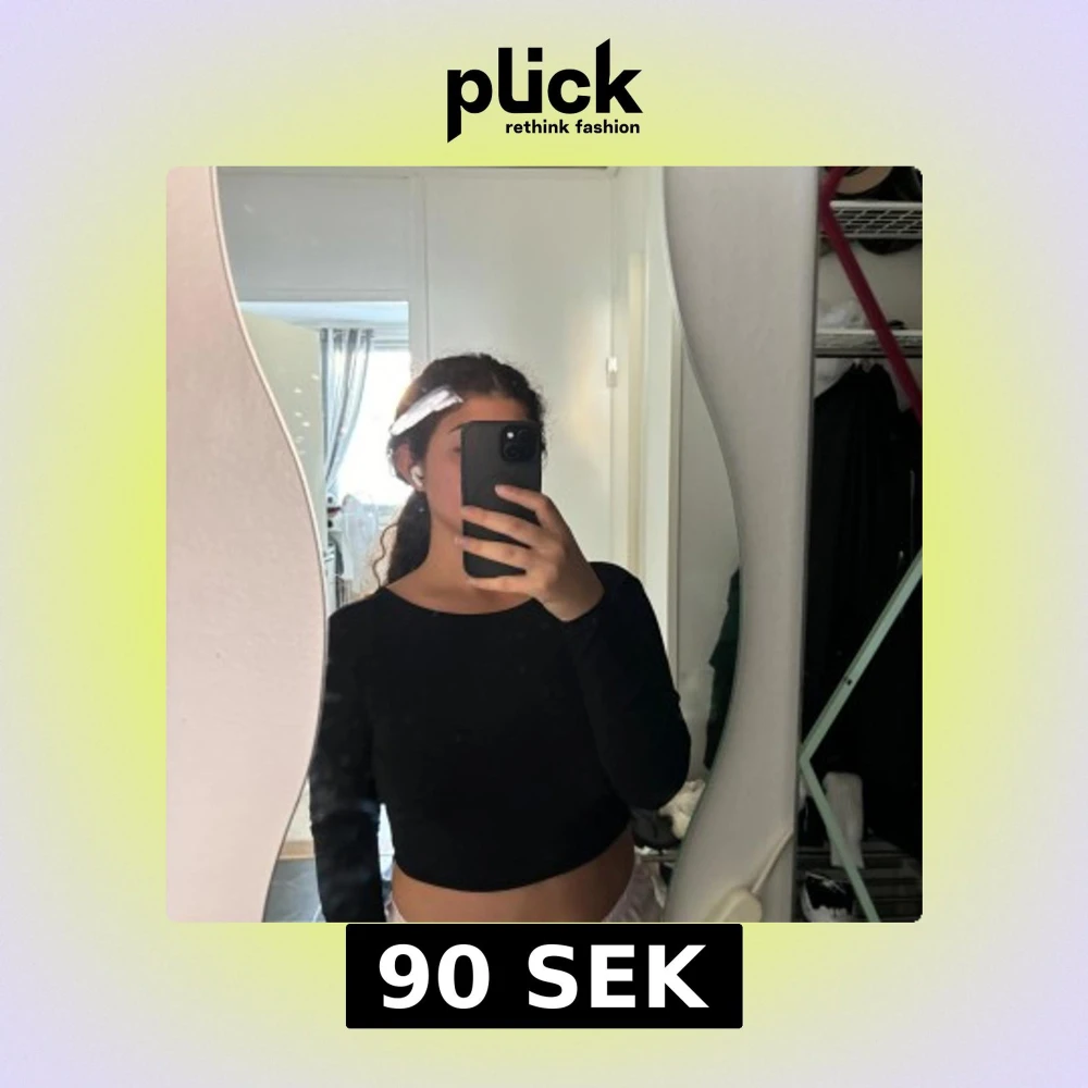 Säljer en svart croppad topp med långa ärmar och snygg öppen rygg med knyt. Perfekt för dig som vill ha en stilren men ändå trendig look. Toppen är figurnära och passar till många olika outfits.