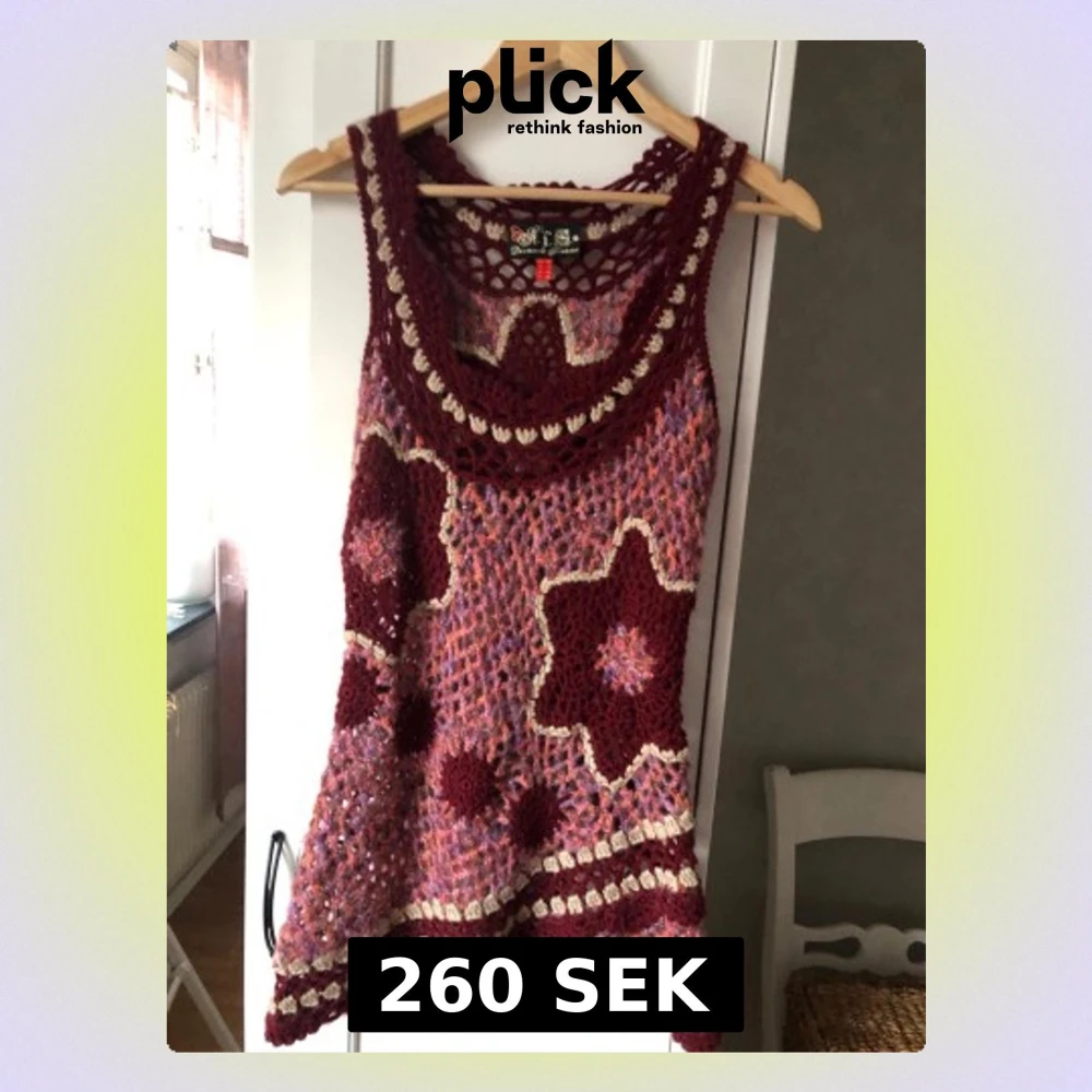 Unik virkad klänning i vinröda, rosa och beige toner. Klänningen är ärmlös, kort och har stora blommiga mönster samt bohemiska detaljer. Perfekt för dig som gillar färg och retrostil. Materialet är stickad syntet och ullmix.