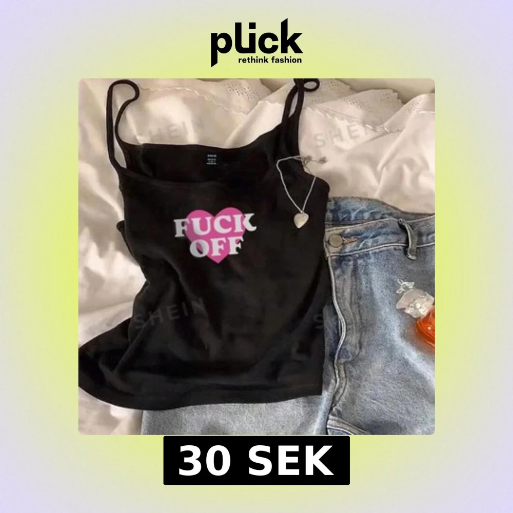 Snyggt svart linne med tunna axelband och ett iögonfallande tryck i vitt och rosa framtill. Perfekt för en avslappnad stil med attityd.