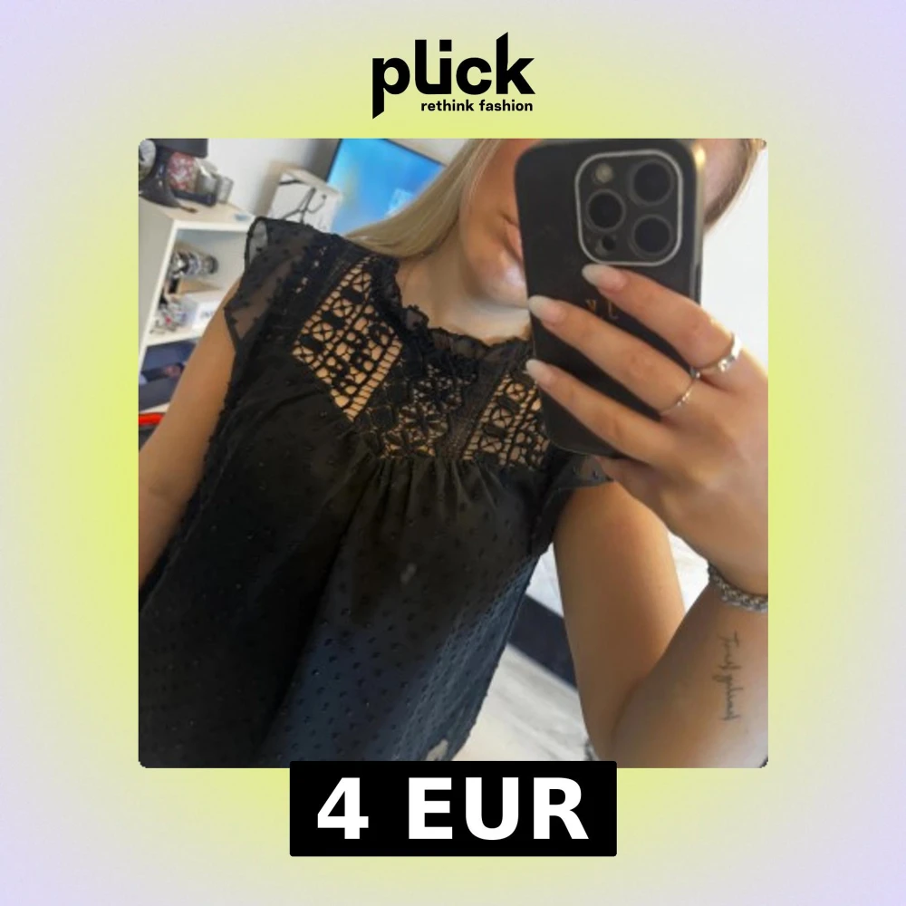 Säljer en svart blus med transparenta partier och spets upptill. Blusen har små prickar i tyget, volangdetaljer vid axlarna och är ärmlös. Perfekt för dig som gillar romantiska detaljer och en luftig känsla.