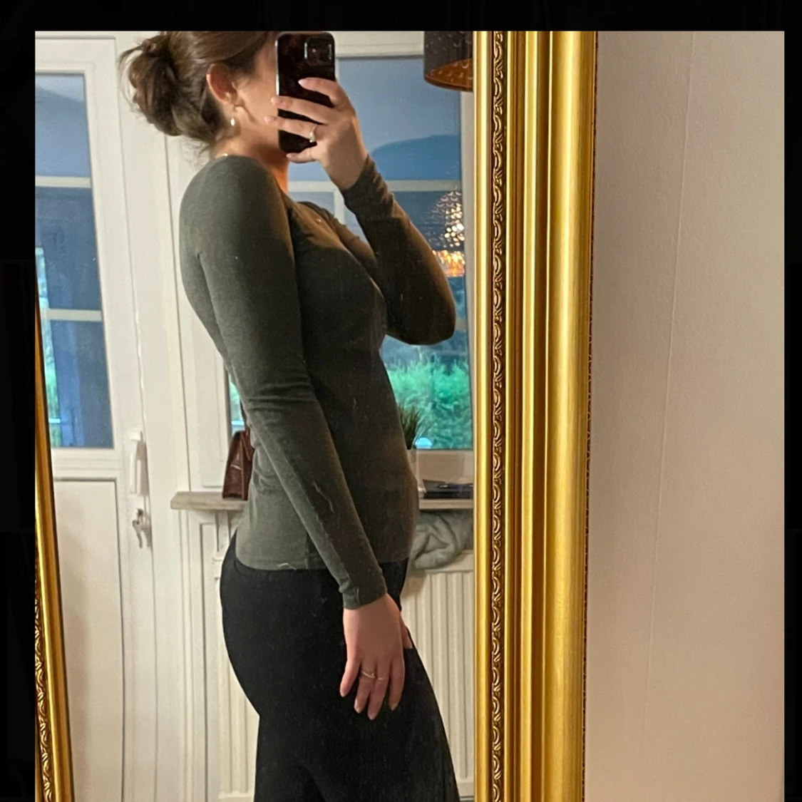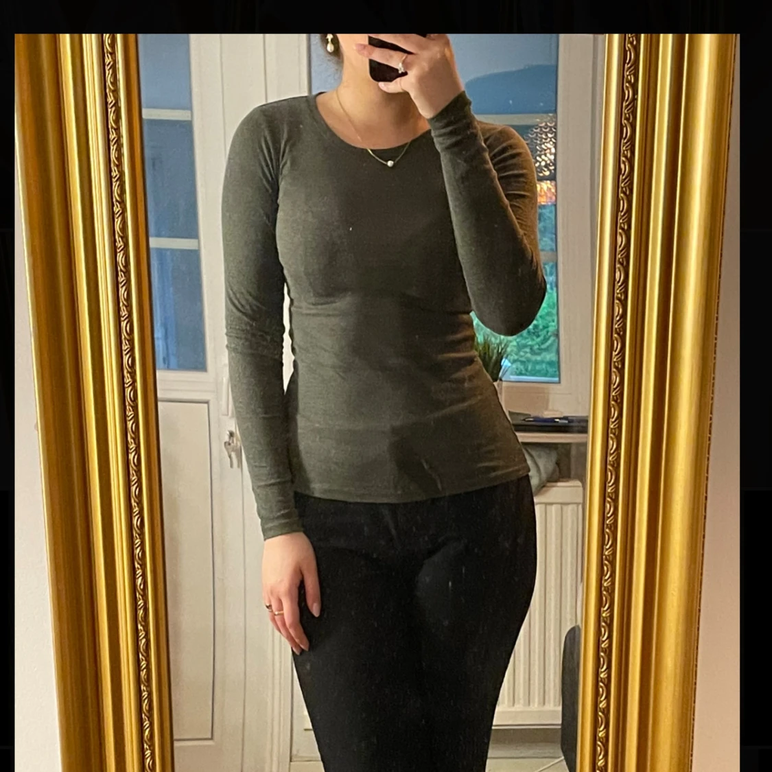 En enkel mörkgrön långärmad topp med rund halsringning. Modellen är figurnära och passar perfekt till jeans eller kostymbyxor.